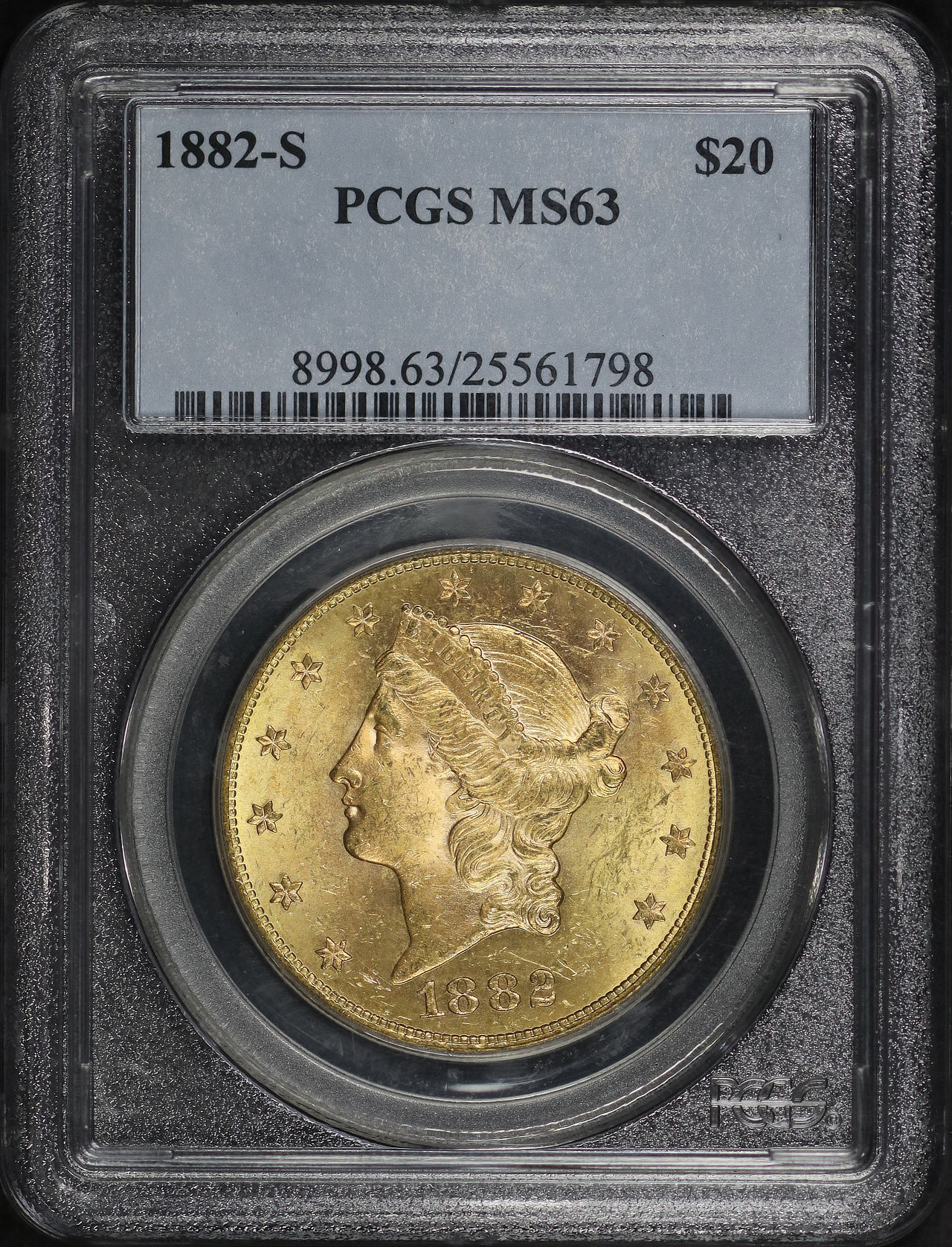 1882-S Liberty Head $20 Type 3 PCGS MS-63 designed by James Barton Longacre.