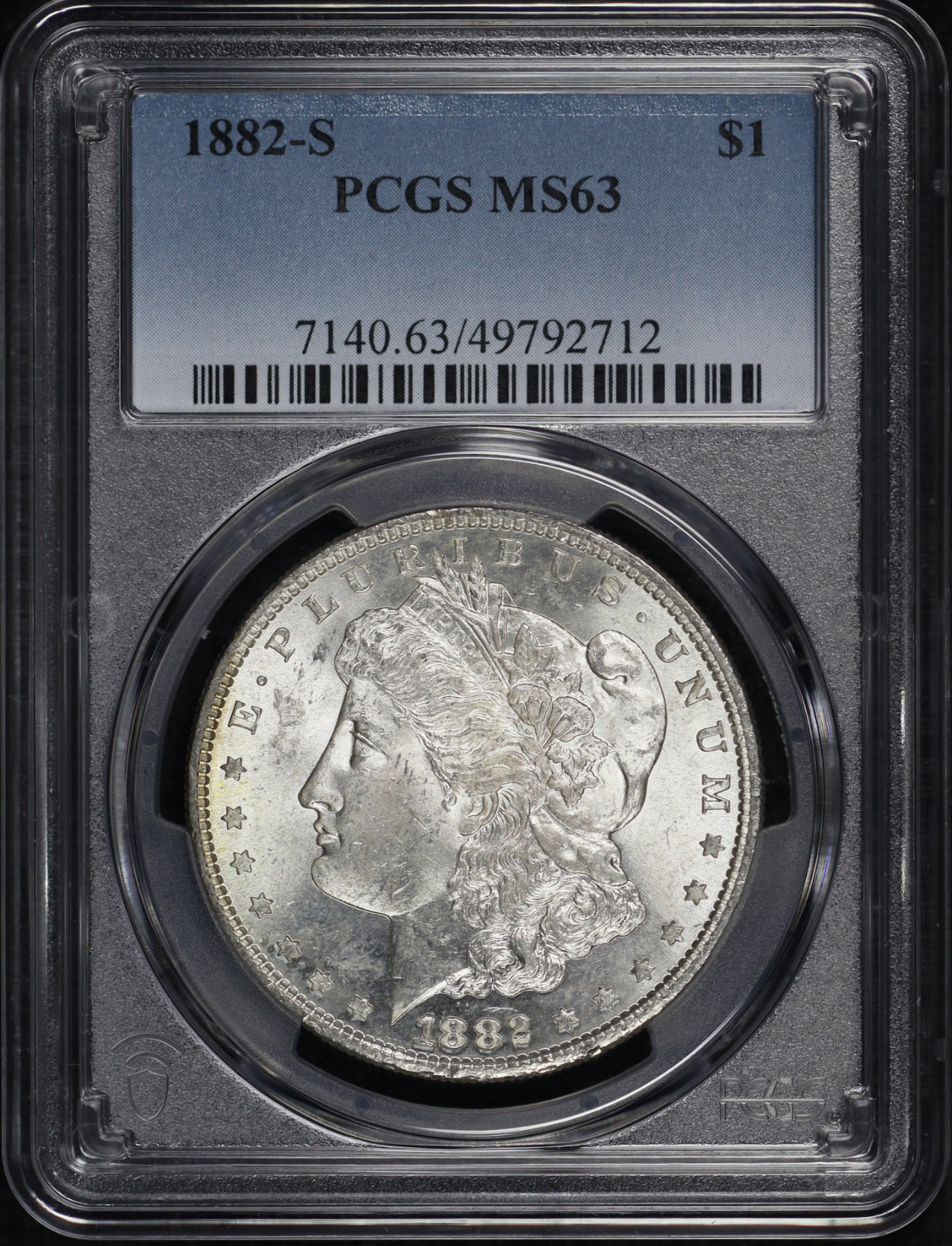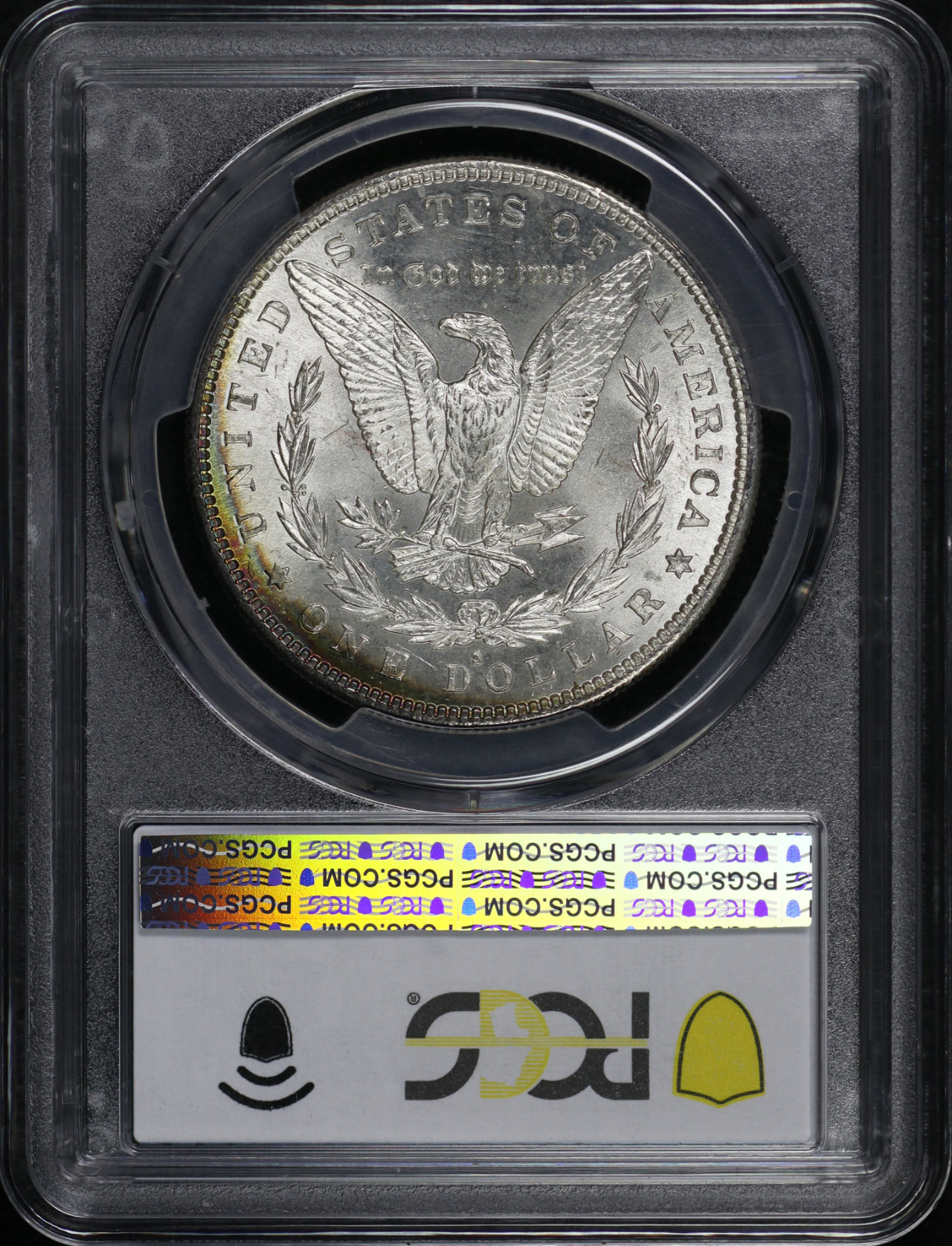 1882-S Morgan Dollar PCGS MS-63 designed by George T. Morgan. The reverse shows nice rainbow toning along the rim, with strong bands of blue, green, orange, and violet!