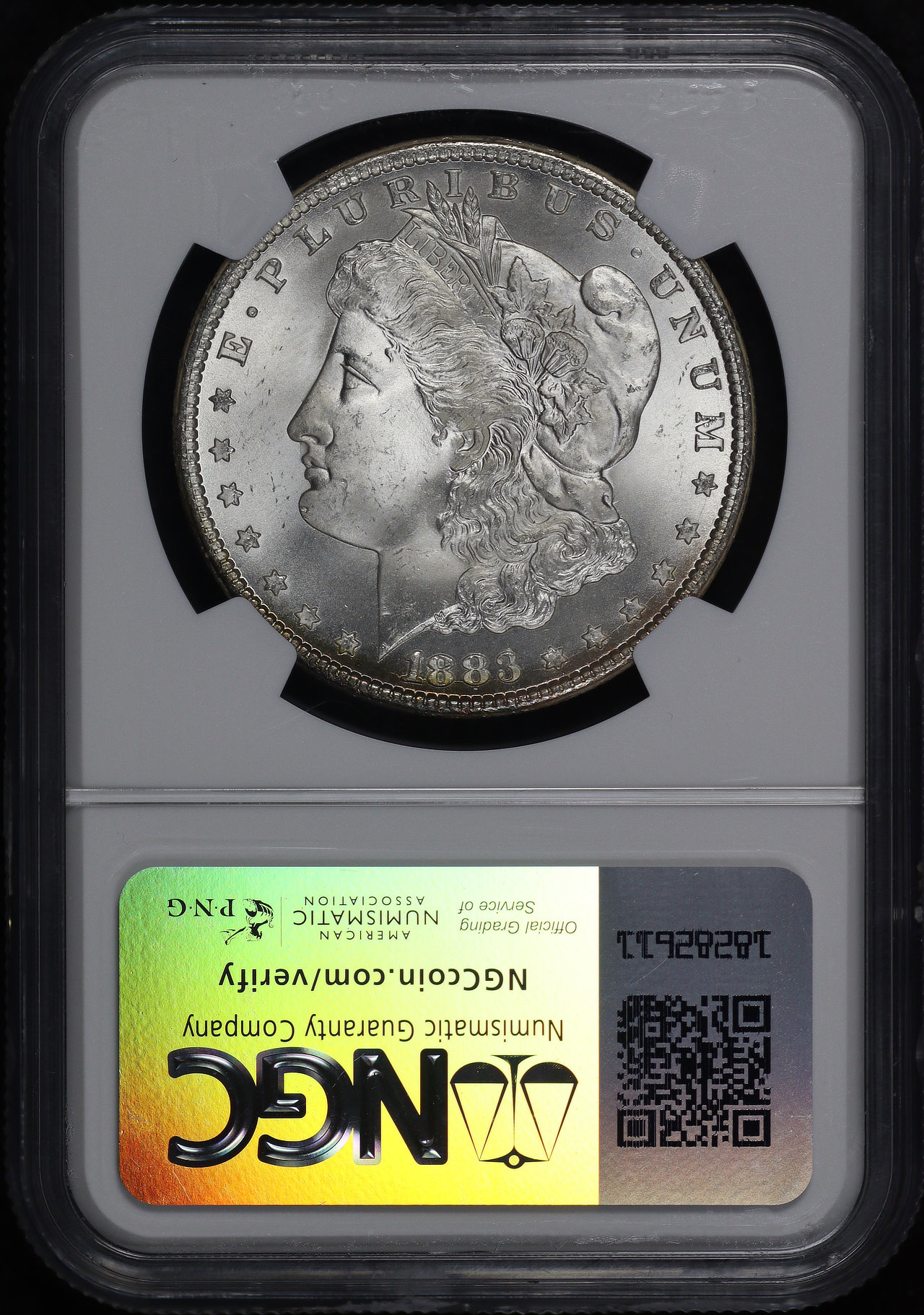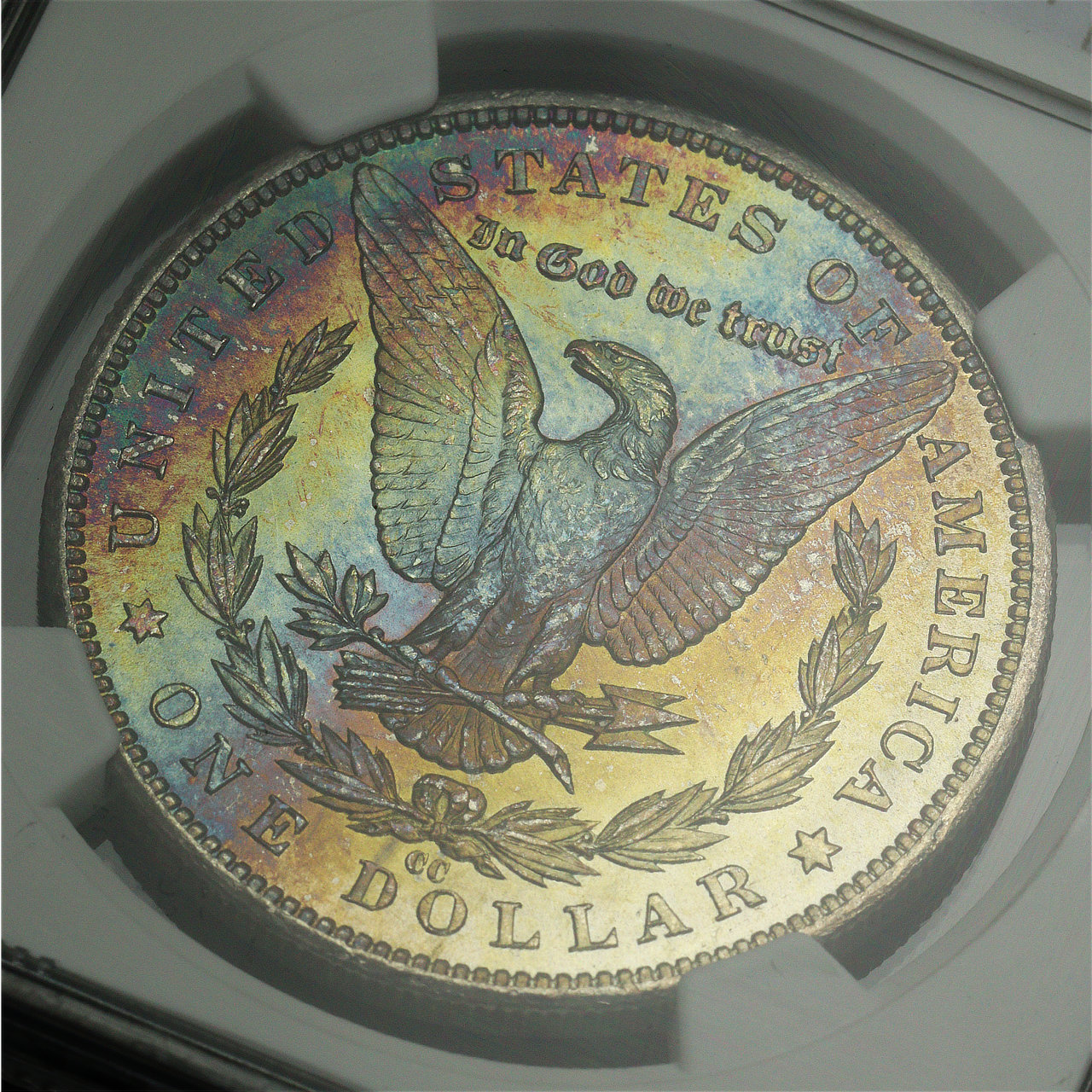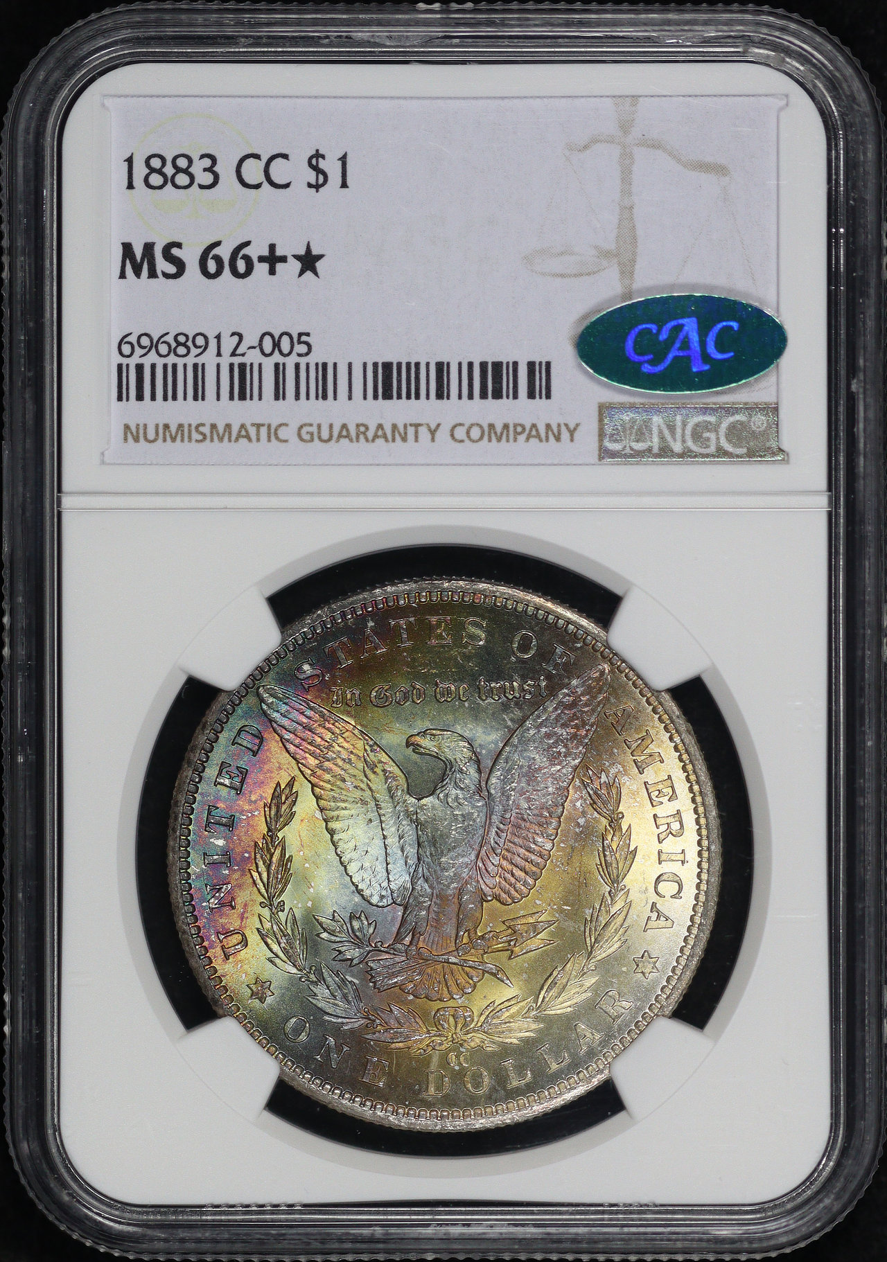 1883-CC Morgan Dollar NGC MS-66+ ★ CAC. The reverse offers a stunning array of blue, green, and fiery sunset hues, all in nice, strong bands!