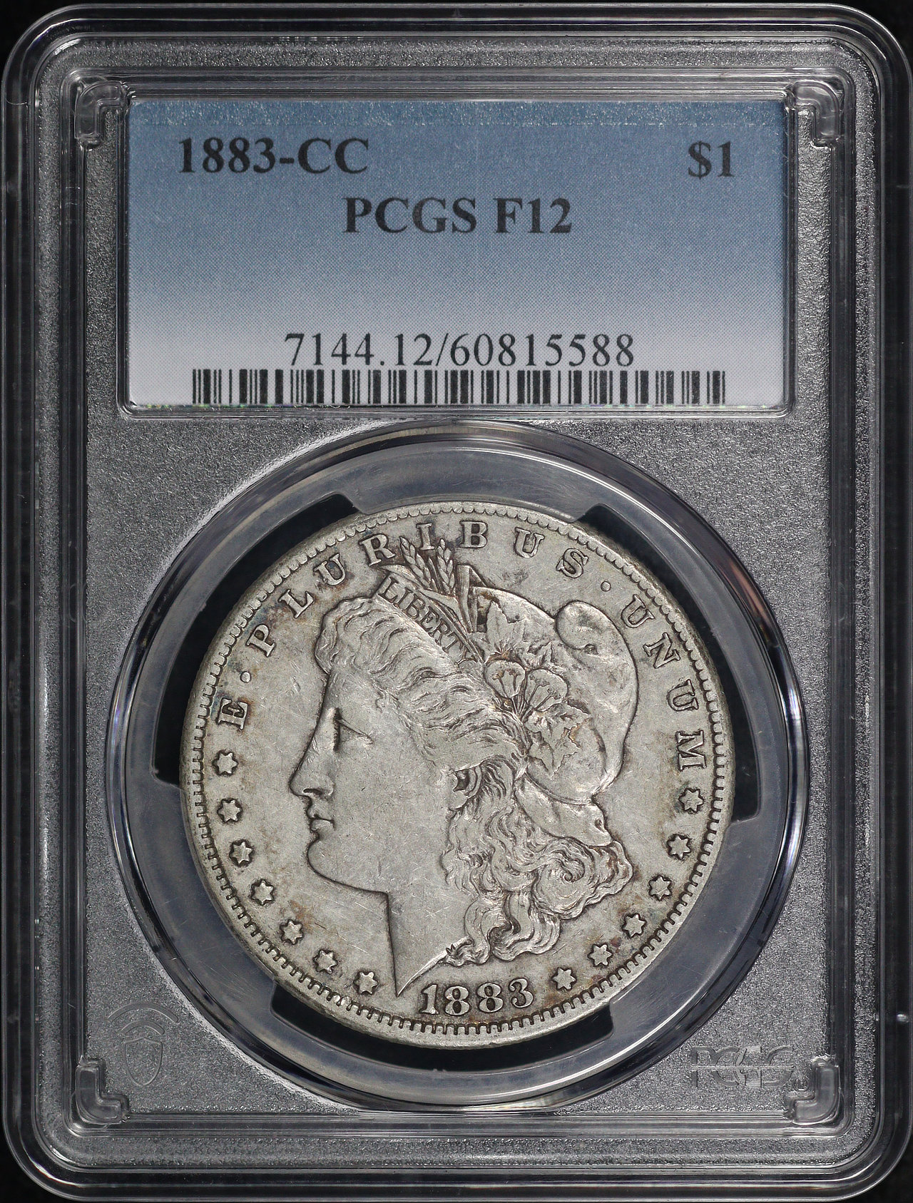 1883-CC Morgan Dollar PCGS F-12 designed by George T. Morgan. Although graded F-12, in our opinion the coin looks VF/XF!