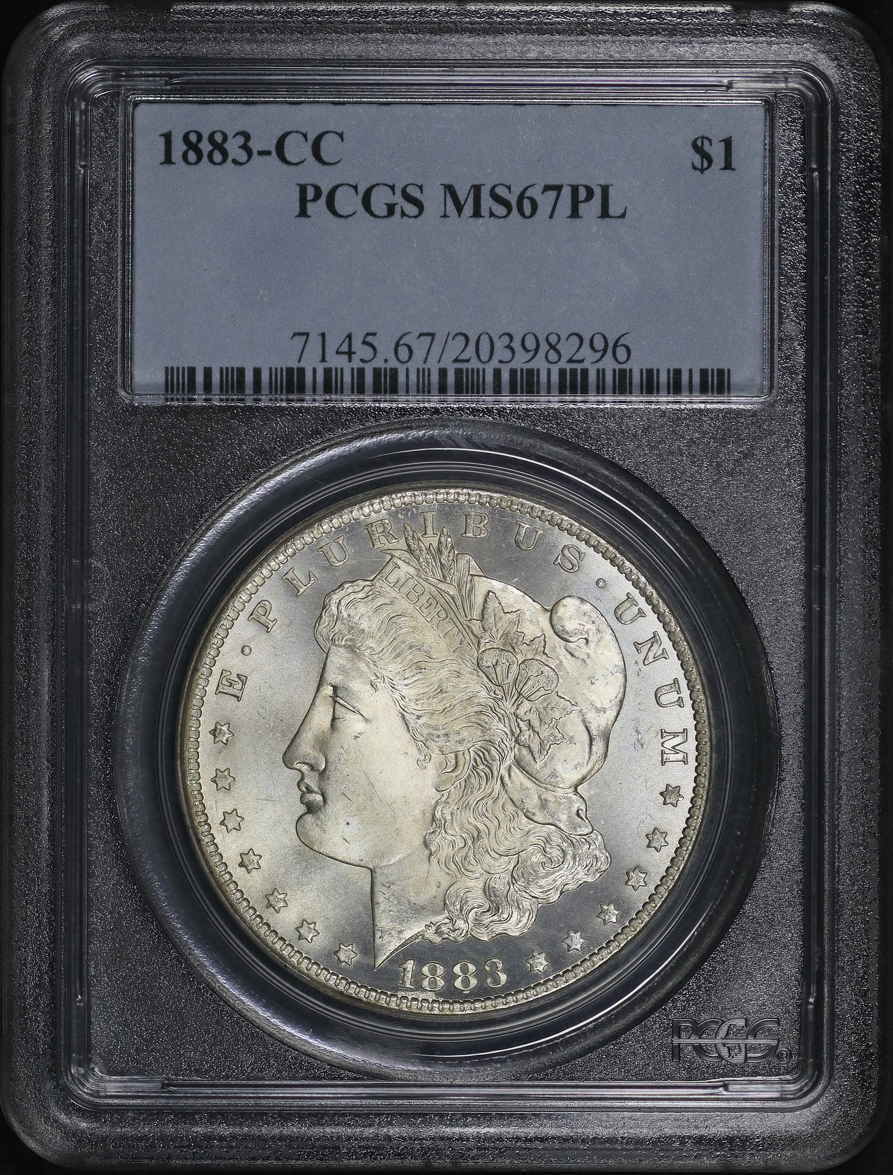 1883-CC Morgan Dollar PCGS MS-67 PL designed by George T. Morgan.