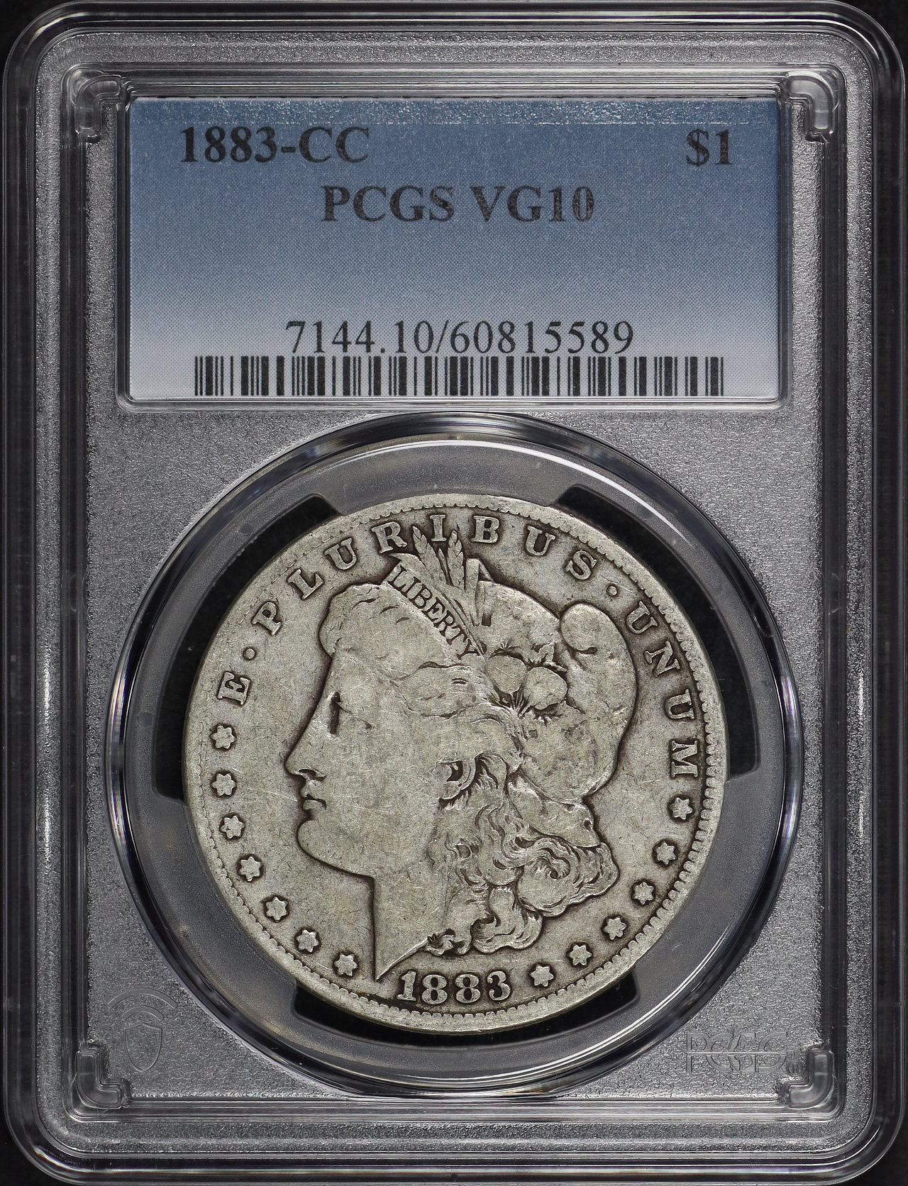 1883-CC Morgan Dollar PCGS VG-10 designed by George T. Morgan.