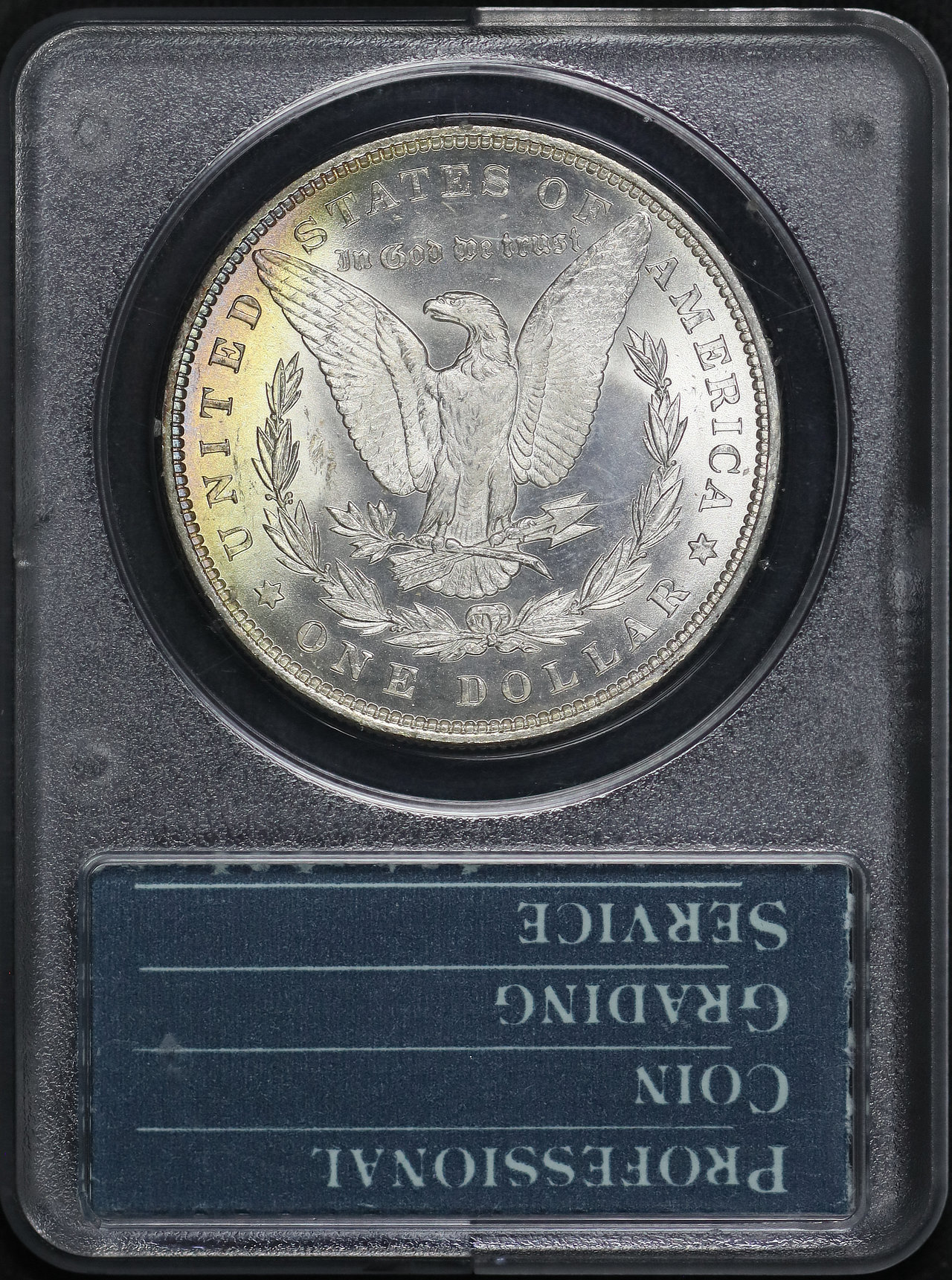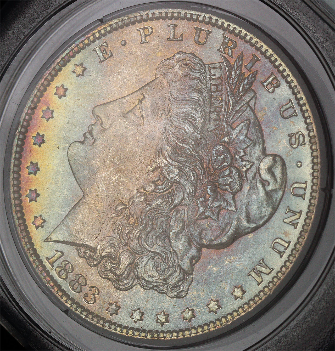 1883 Morgan Dollar PCGS MS-64 CAC Old Green Rattle Holder, Rainbow Obverse Toning