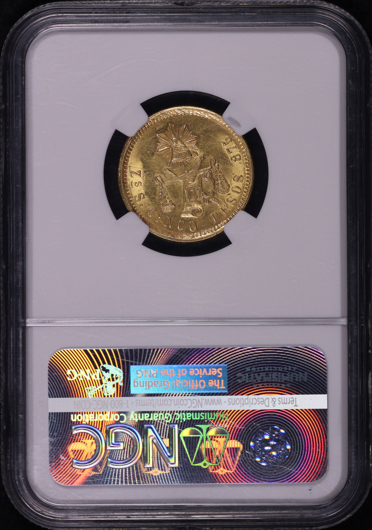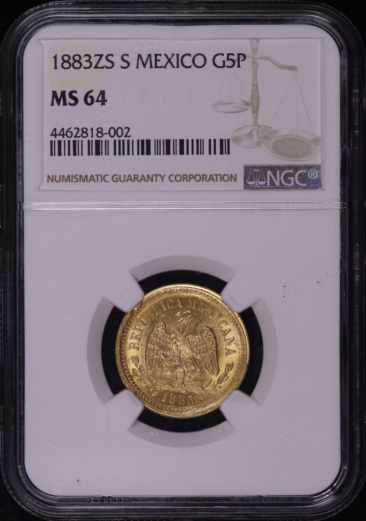1883-Zs S Mexico Gold 5 Pesos KM#412.7 NGC MS-64. There are minor scuffs and scratches on the NGC holder. 0.238 oz AGW.