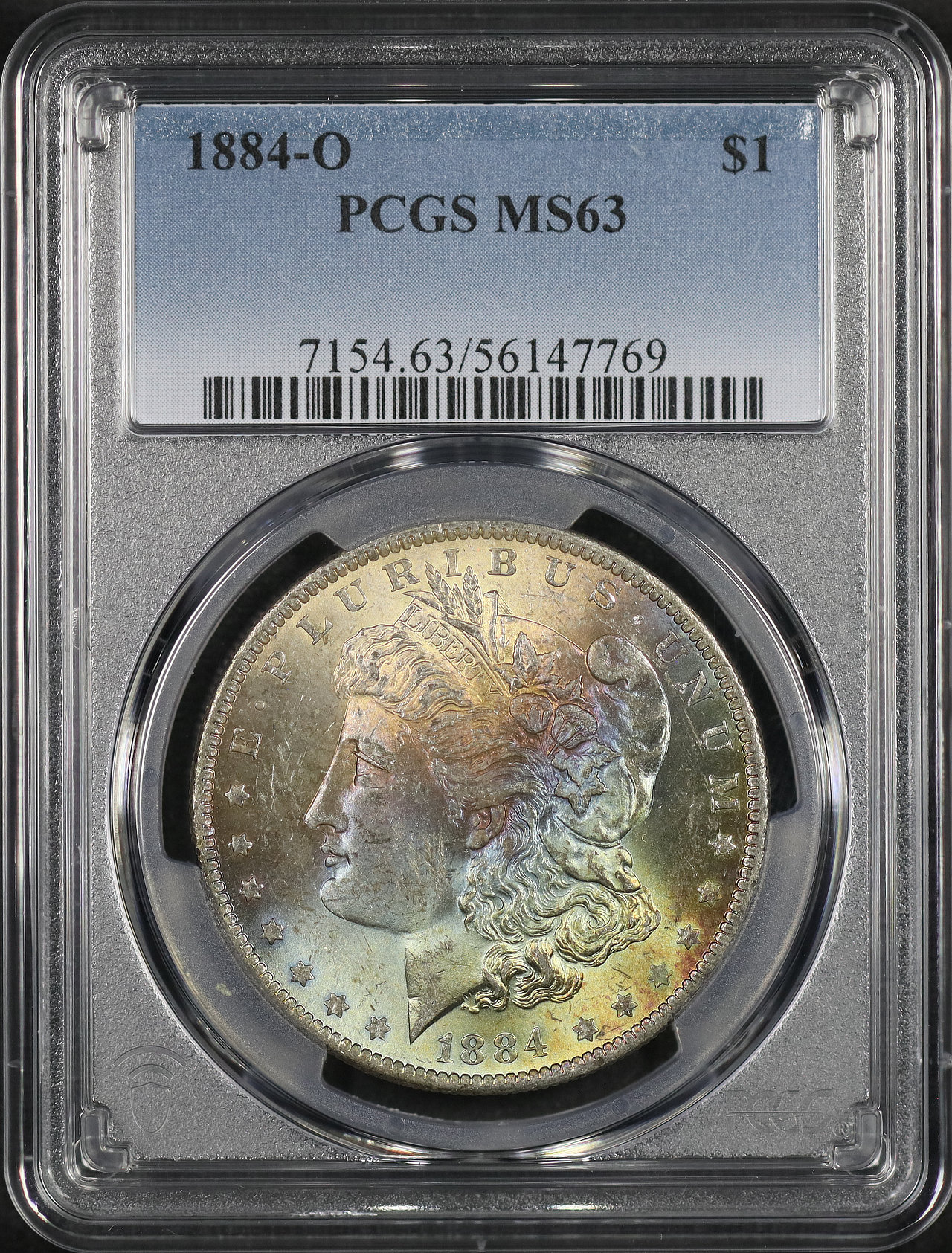 1884-O Morgan Dollar PCGS MS-63 Rainbow Toning designed by George T. Morgan.