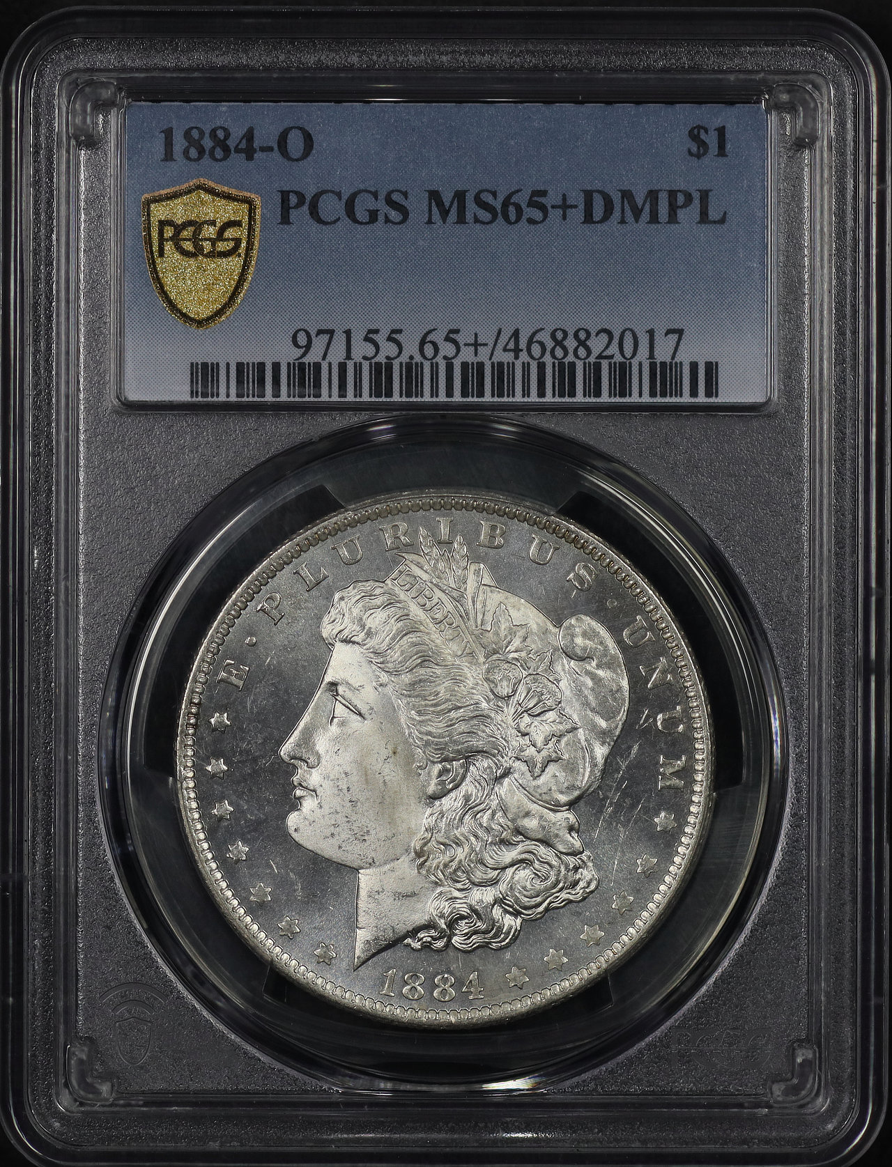1884-O Morgan Dollar PCGS MS-65+ DMPL designed by George T. Morgan.