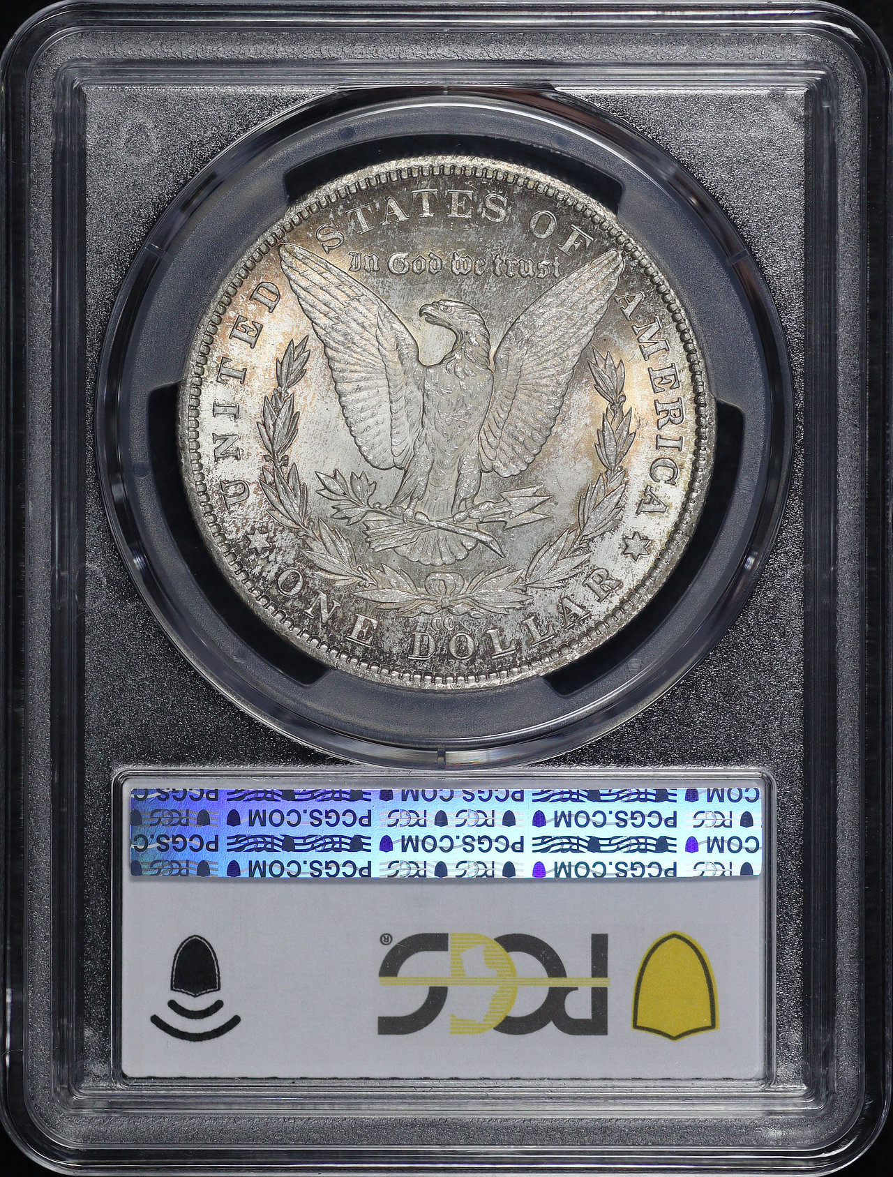 1885-CC Morgan Dollar PCGS MS-64 designed by George T. Morgan. Both sides display spotty crimson/amber hue toning.