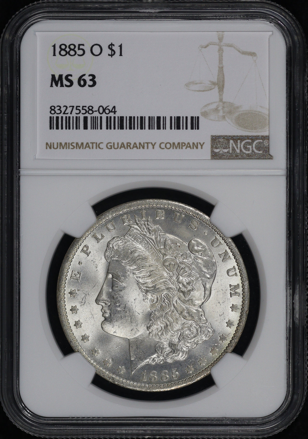 1885-O Morgan Dollar NGC MS-63. There is a nice tab of teal and sunset hue toning on the reverse!