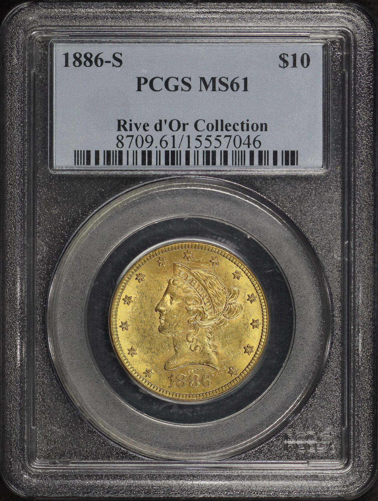 1886-S Liberty Head $10 PCGS MS-61 Rive d’Or Collection designed by Christian Gobrecht.