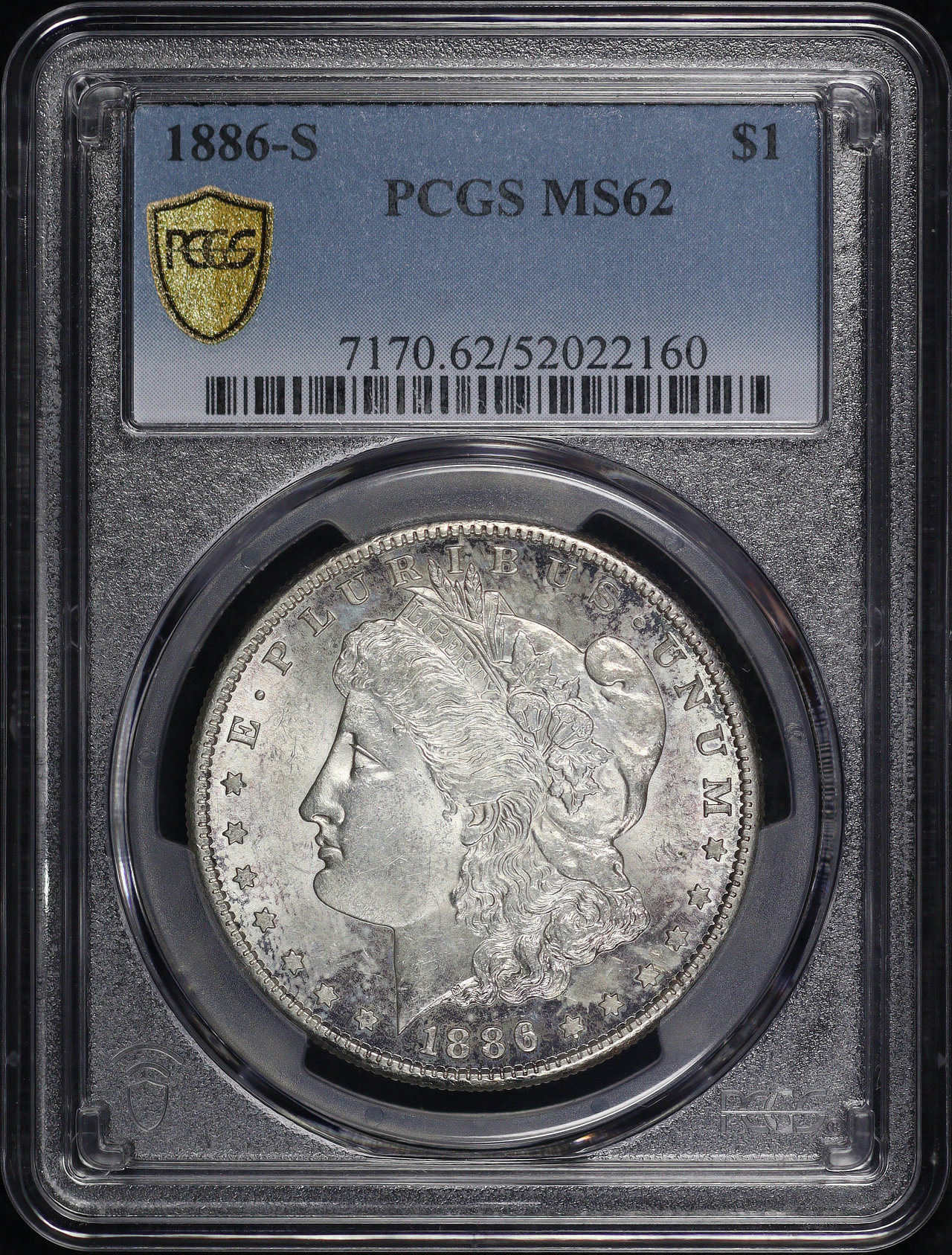 1886-S Morgan Dollar PCGS MS-62 designed by George T. Morgan. Both sides display spotty dark toning.