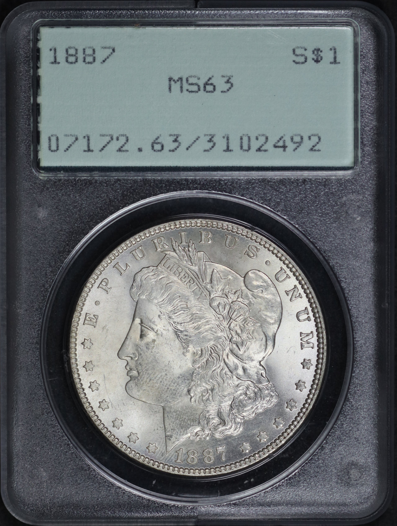 1887 Morgan Dollar PCGS MS-63 Old Green Rattler Holder designed by George T. Morgan.
