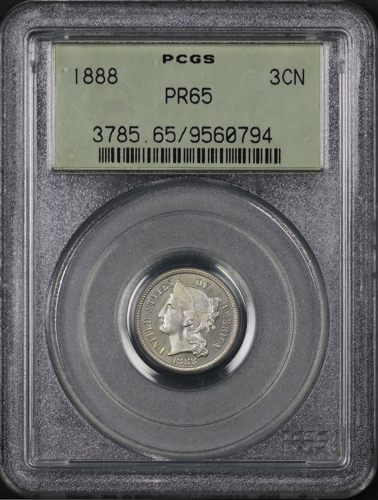 1888 Three Cent Nickel PCGS PR-65 Old Green Holder designed by James Barton Longacre.