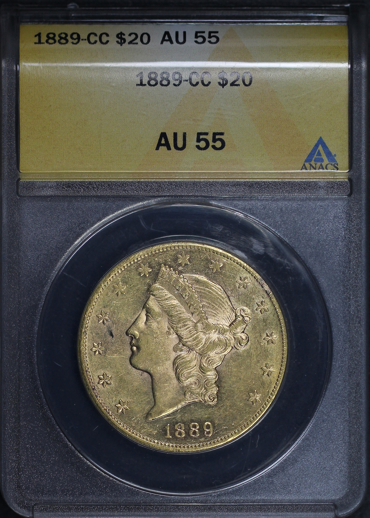 1889-CC Liberty Head $20 Type 3 ANACS AU-55 designed by James Barton Longacre.