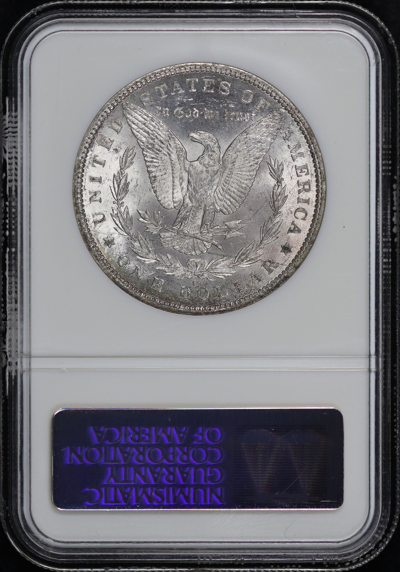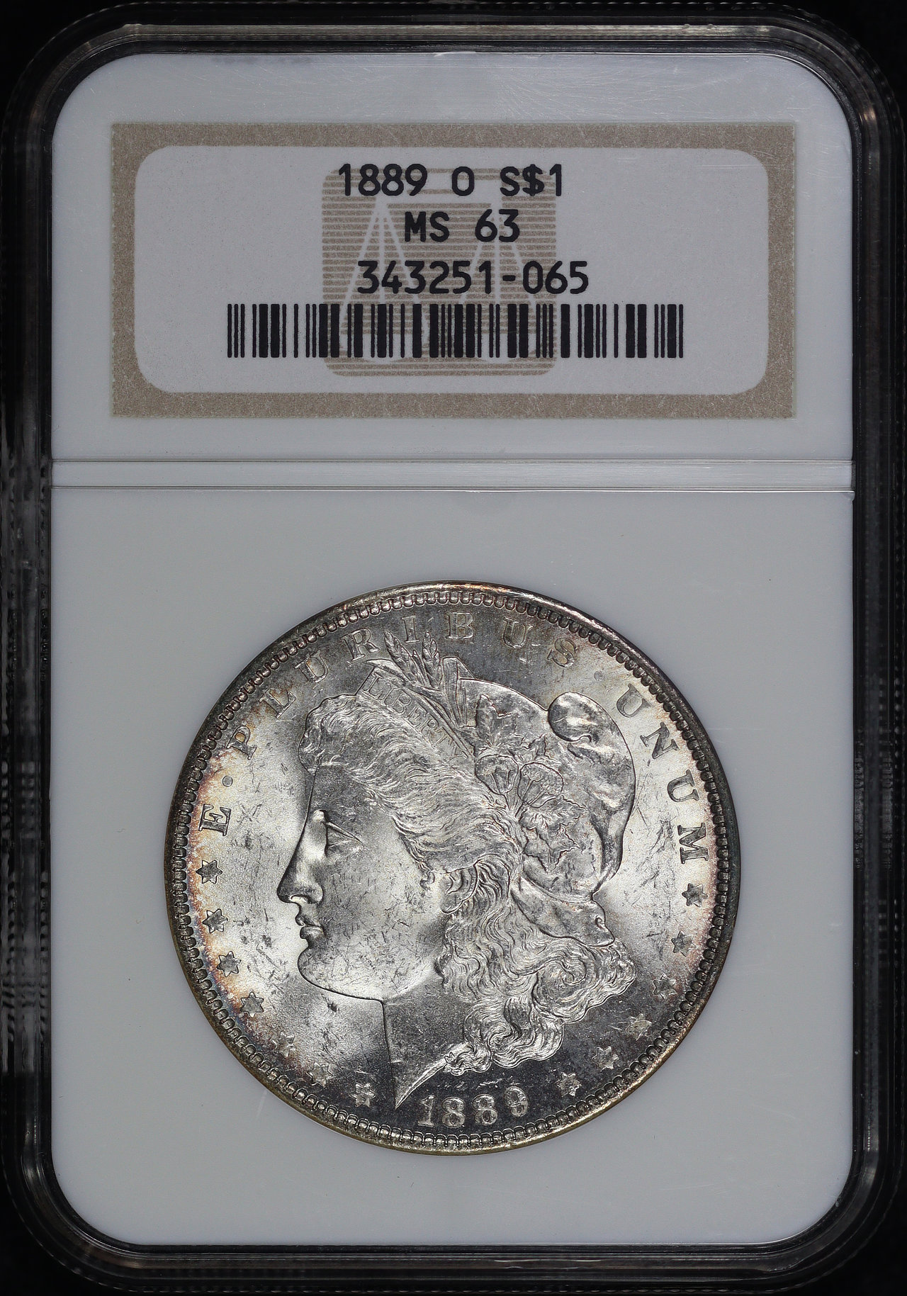 1889-O Morgan Dollar NGC MS-63. Both sides display very faint blue and violet hue toning.