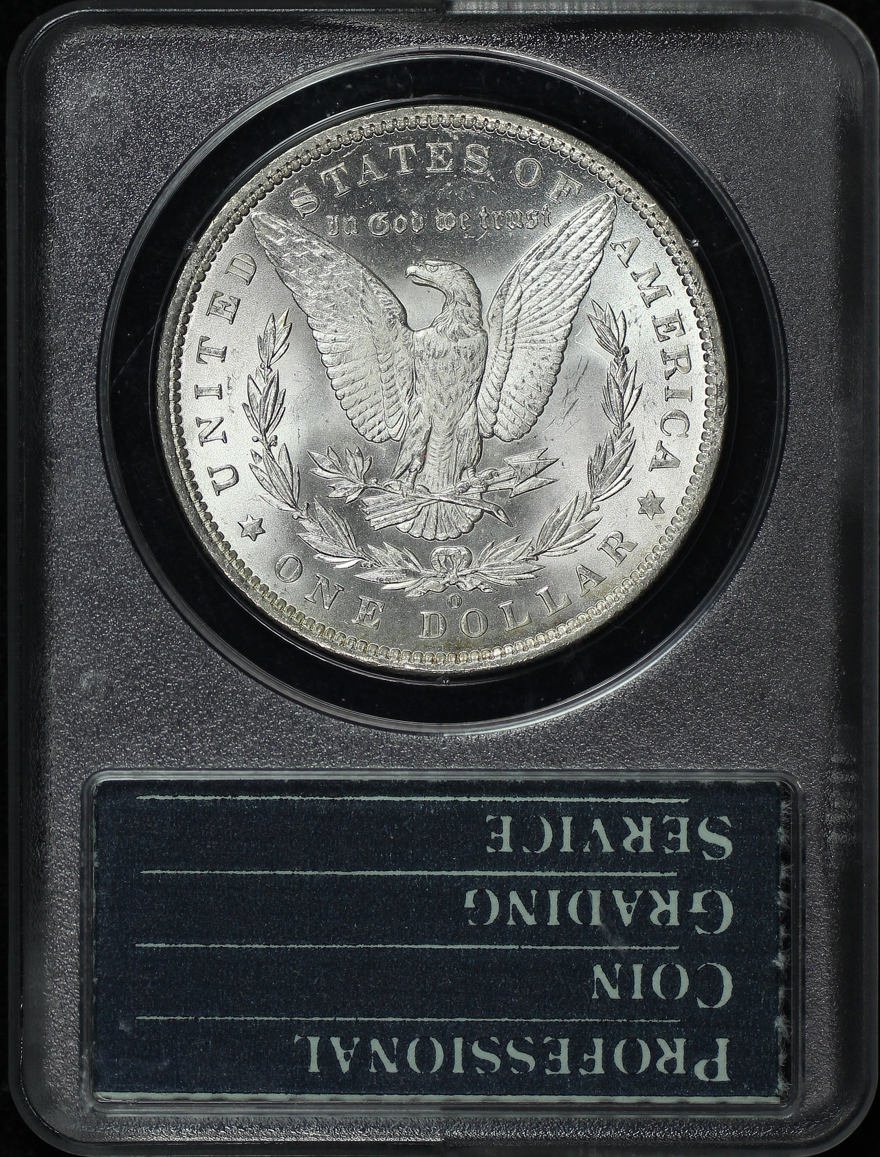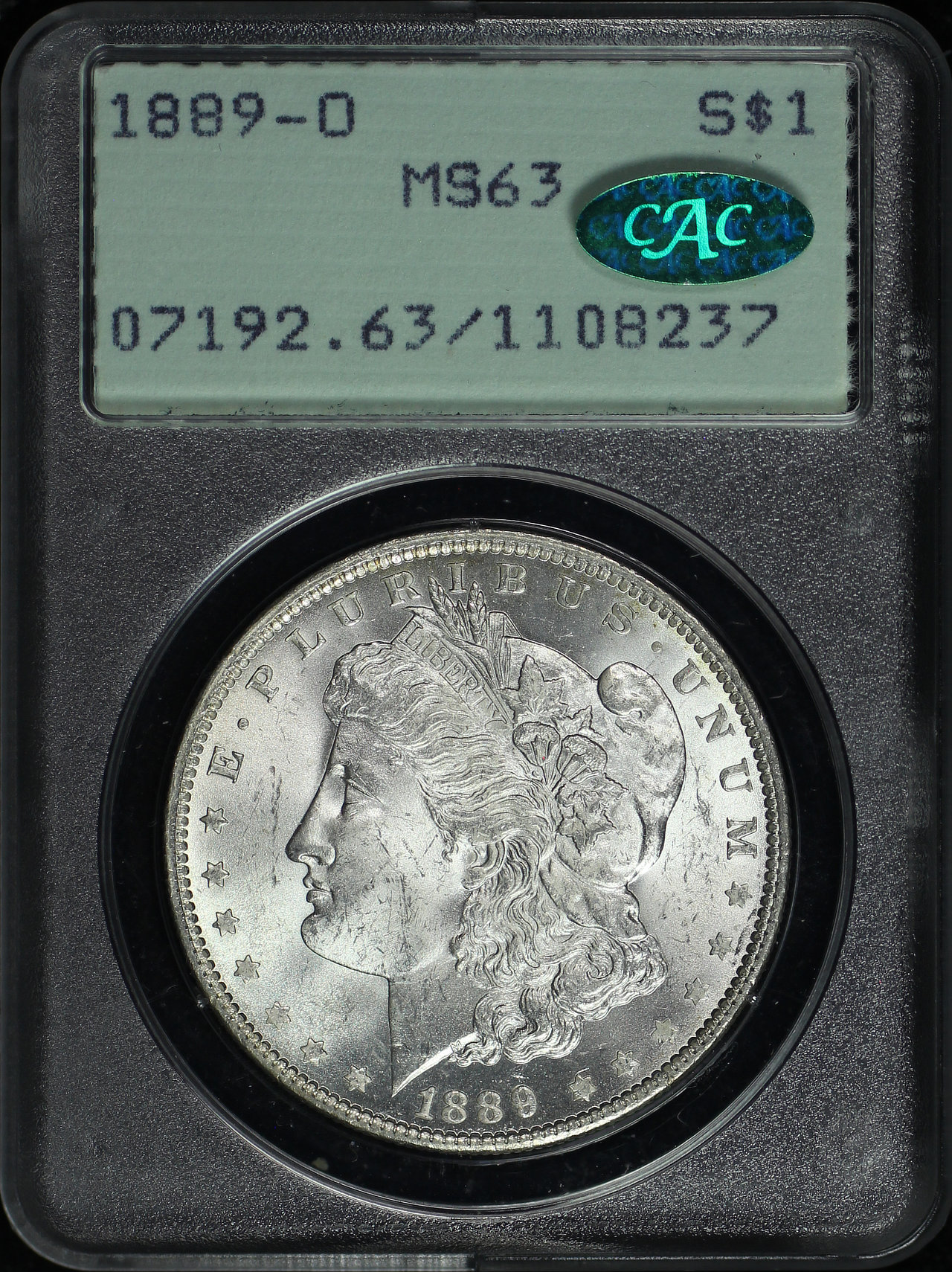 1889-O Morgan Dollar PCGS MS-63 CAC Old Green Rattler Holder designed by George T. Morgan.