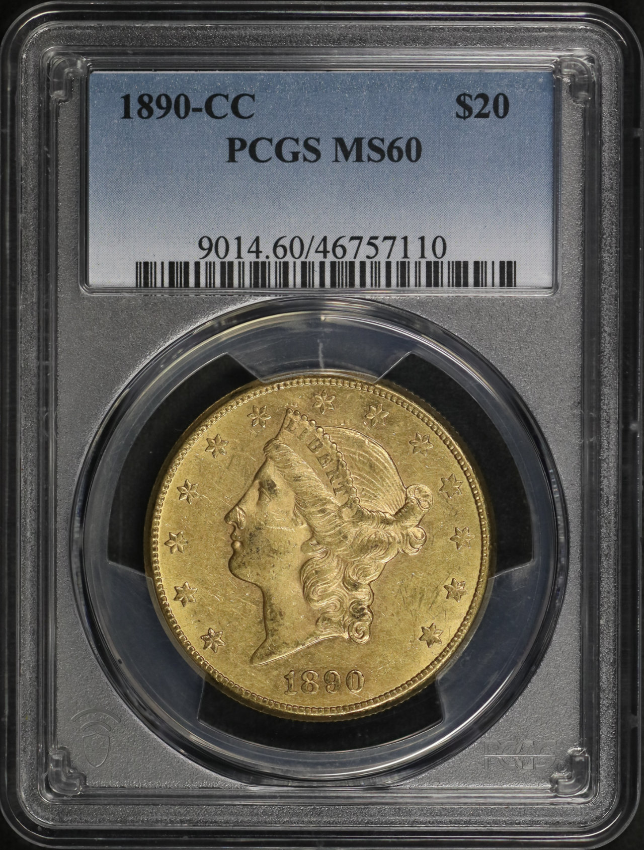 1890-CC Liberty Head $20 Type 3 PCGS MS-60 designed by James Barton Longacre.
