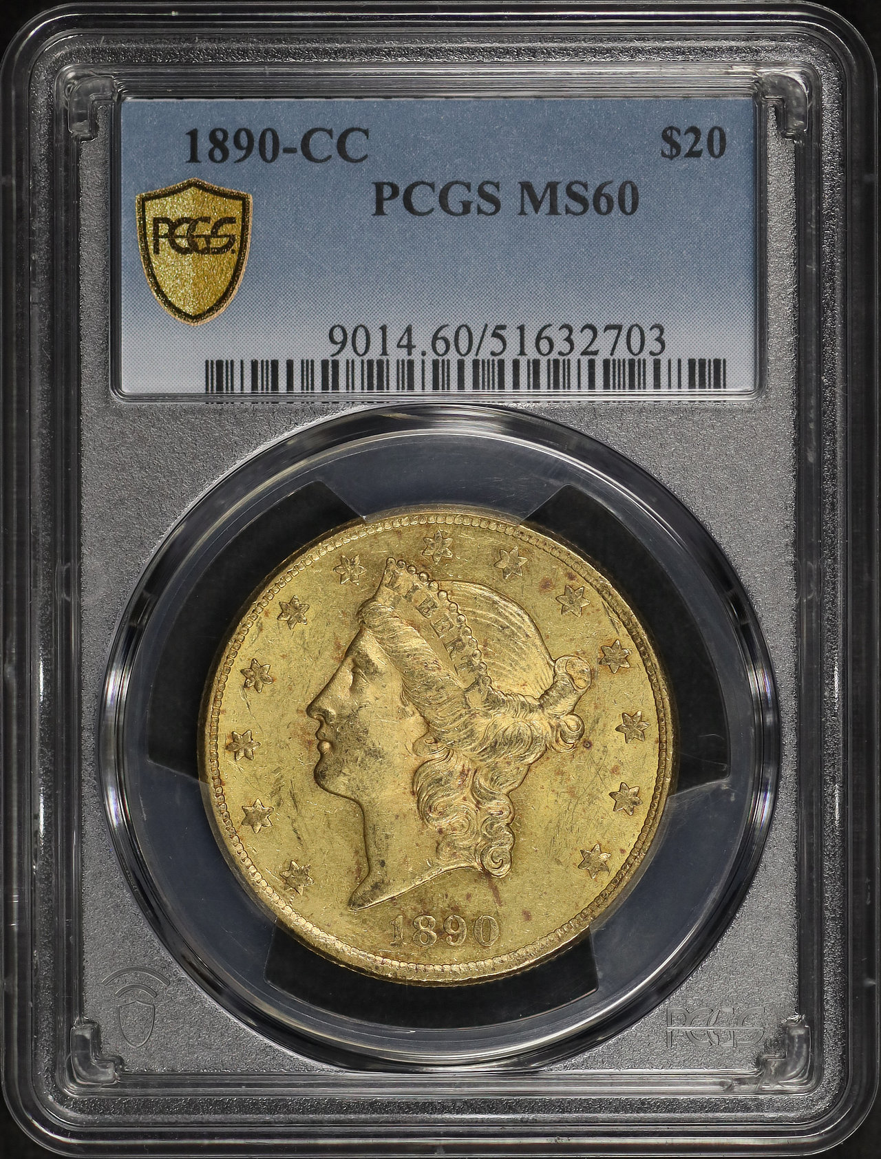 1890-CC Liberty Head $20 Type 3 PCGS MS-60 designed by James Barton Longacre.