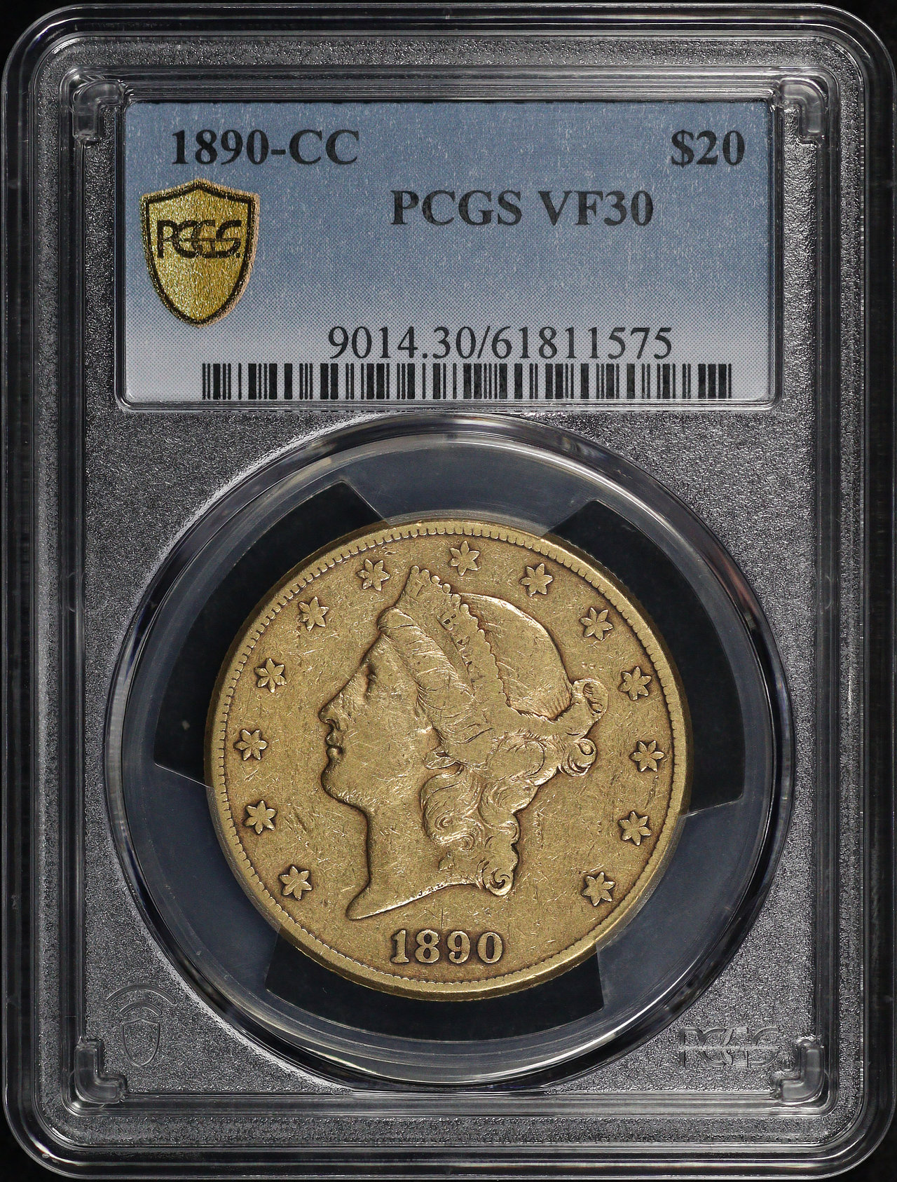 1890-CC Liberty Head $20 Type 3 PCGS VF-30 designed by James Barton Longacre.