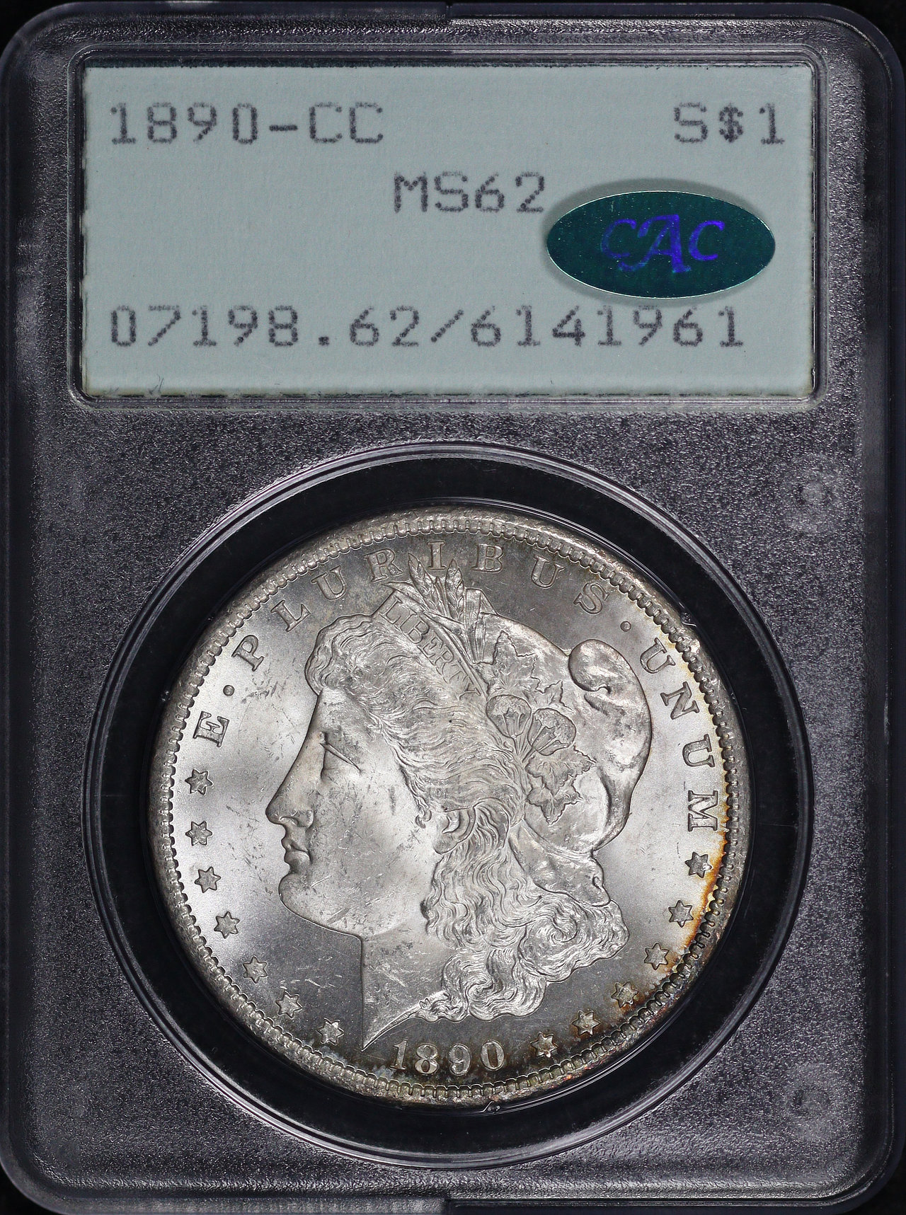 1890-CC Morgan Dollar PCGS MS-62 CAC Old Green Rattler Holder designed by George T. Morgan.