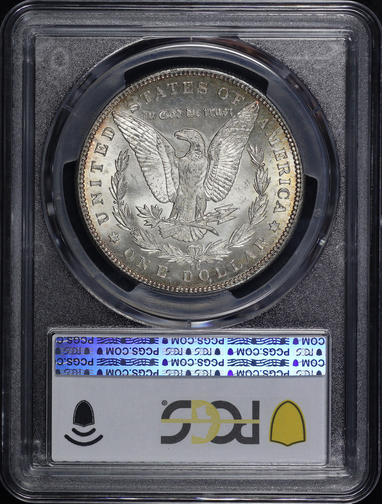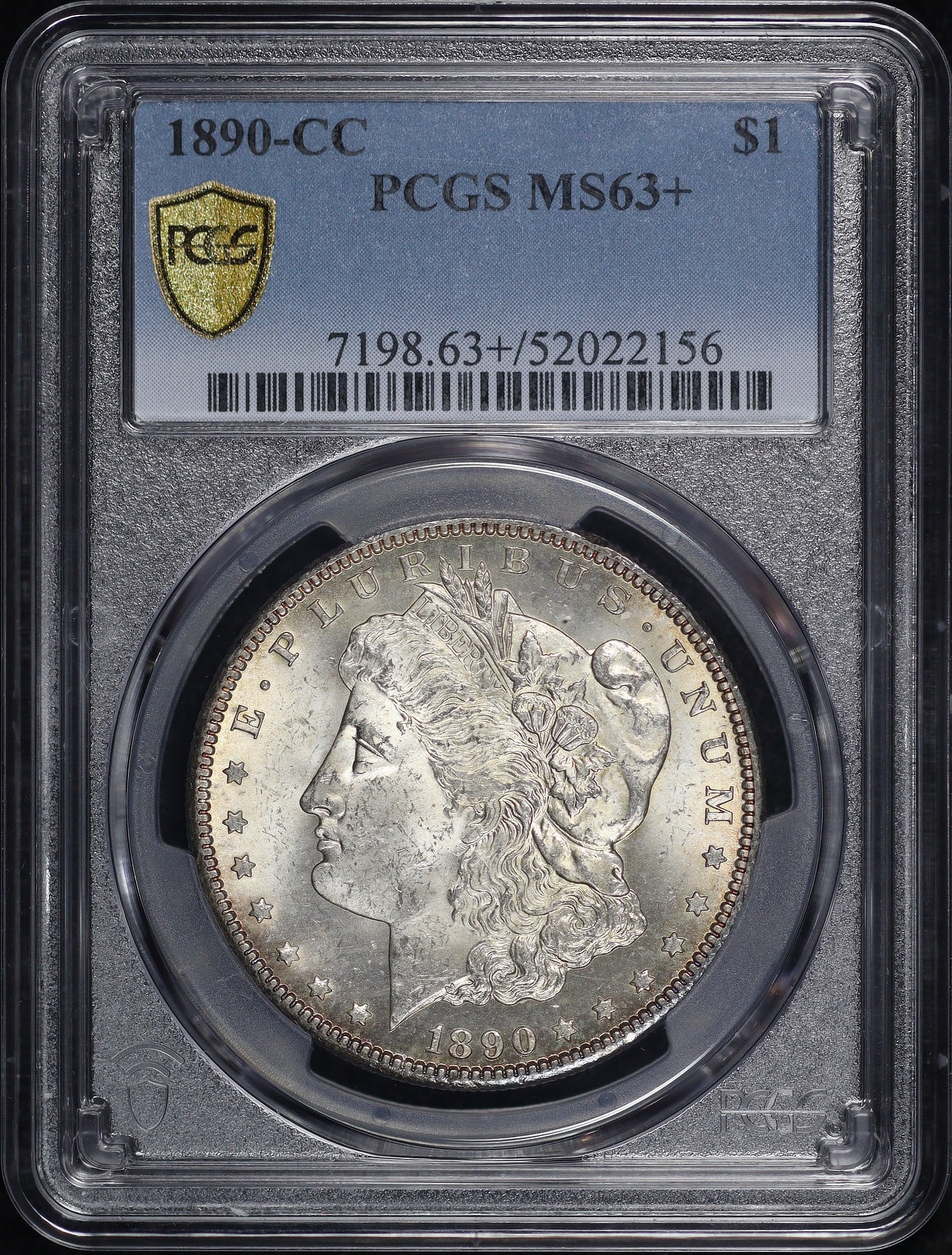1890-CC Morgan Dollar PCGS MS-63+ designed by George T. Morgan. Both sides display smoky crimson hue toning along the rim.
