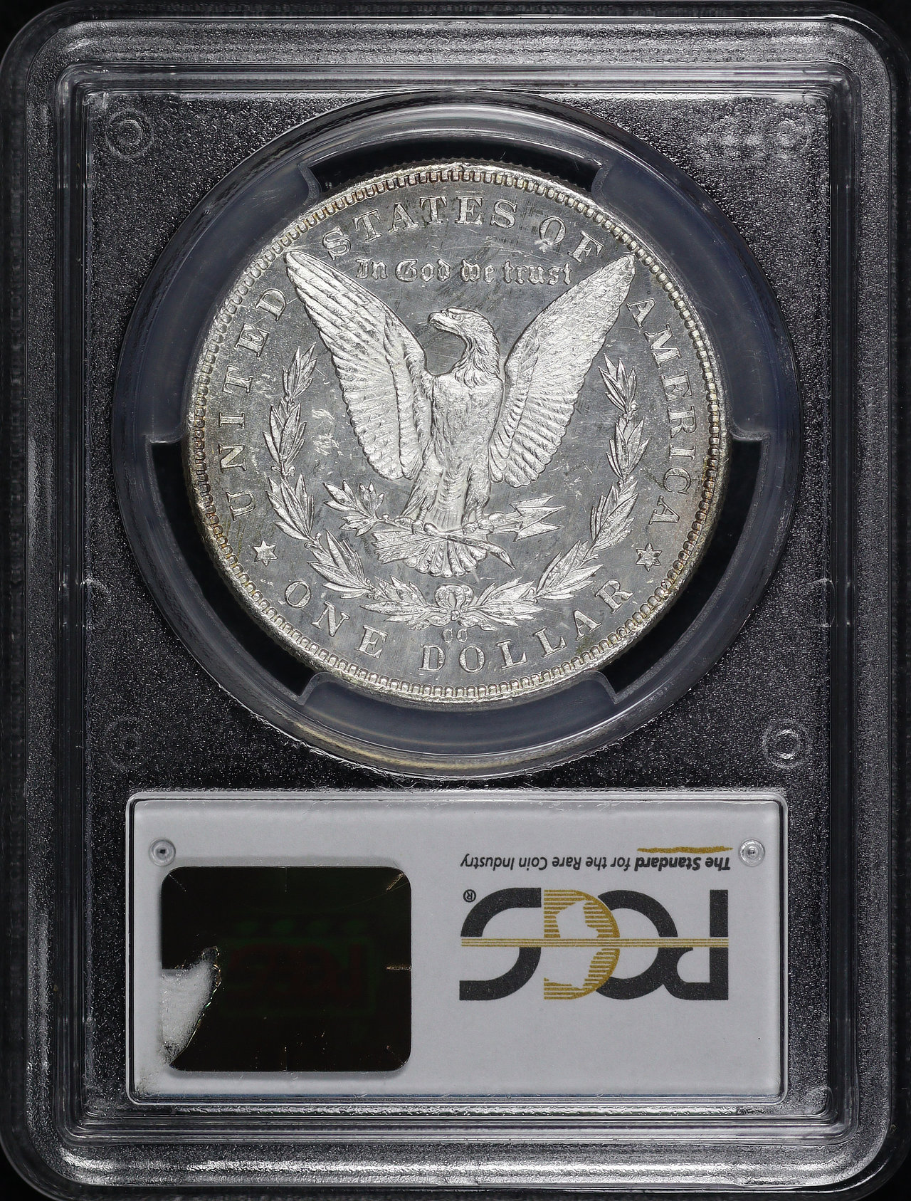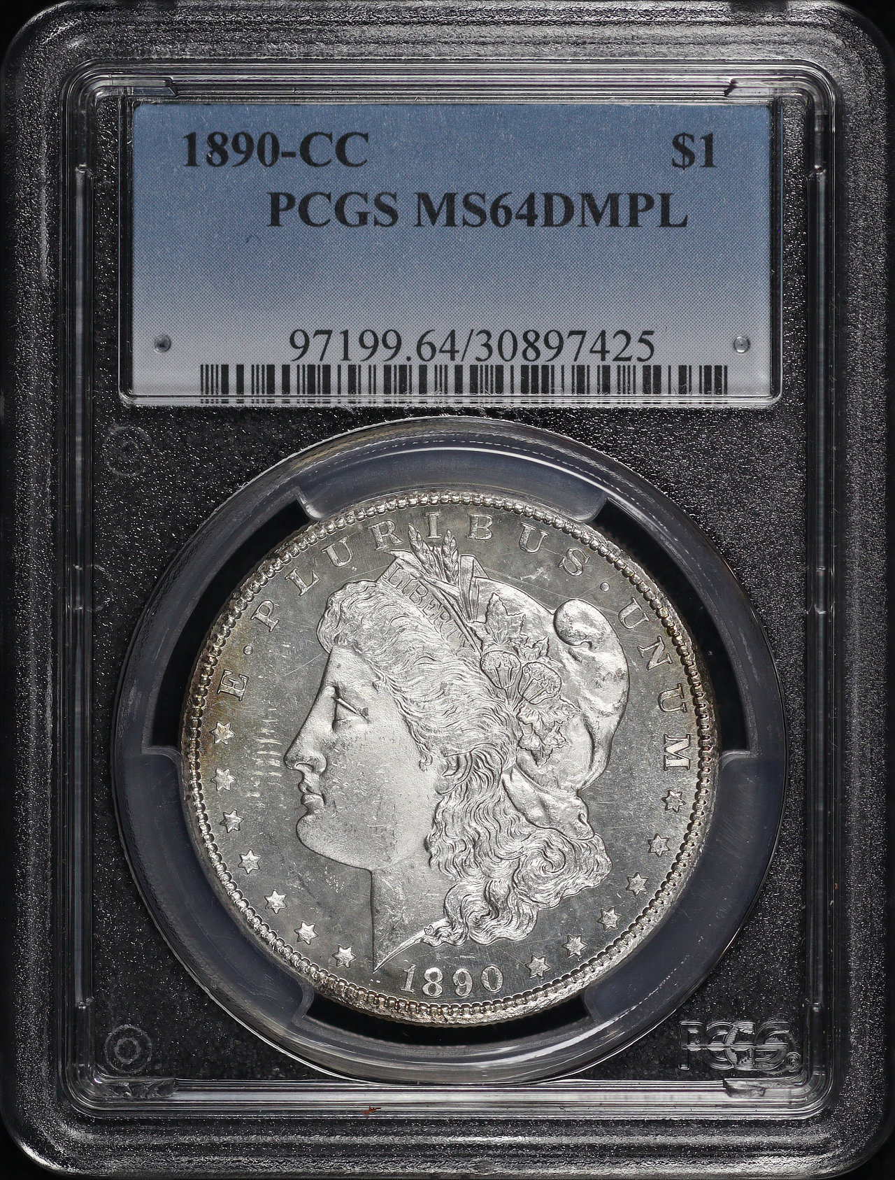 1890-CC Morgan Dollar PCGS MS-64 DMPL designed by George T. Morgan. Both sides display very faint crimson hue toning on spots along the rim.
