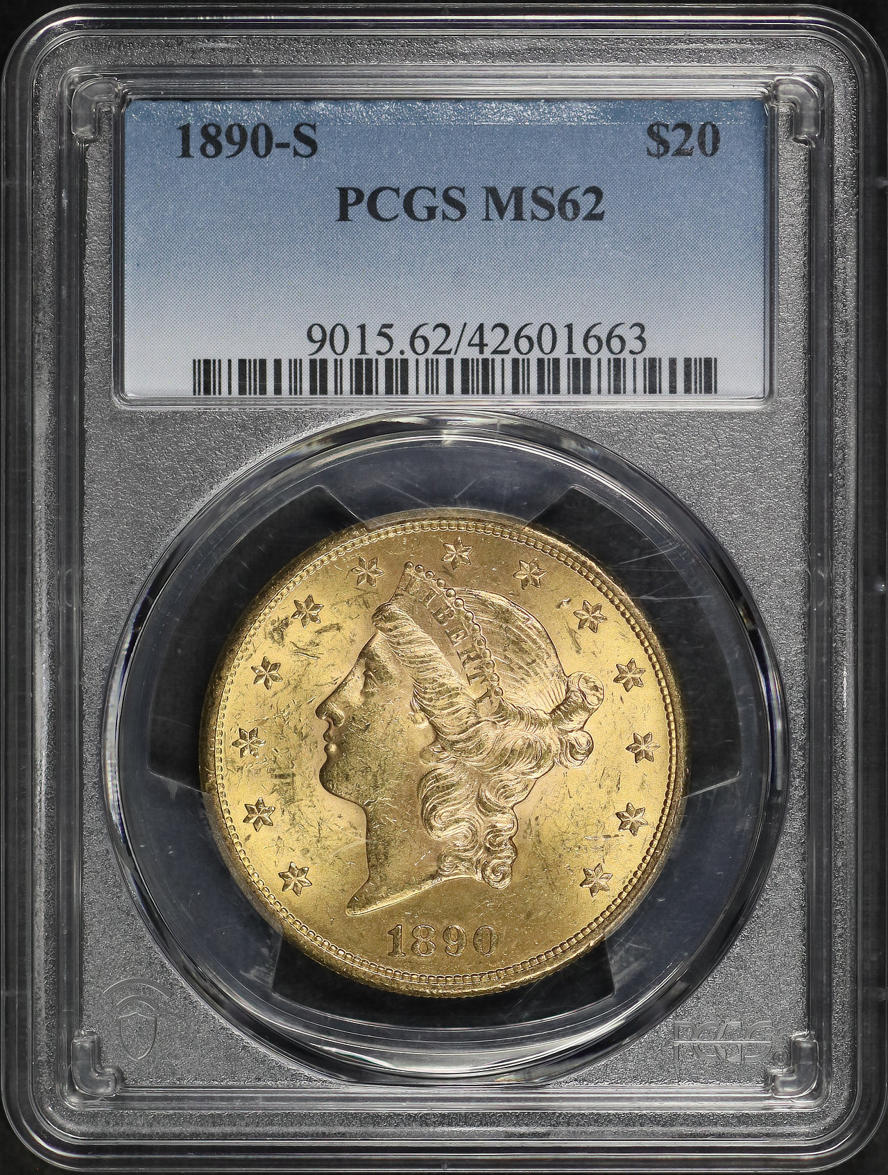 1890-S Liberty Head $20 Type 3 PCGS MS-62 designed by James Barton Longacre.
