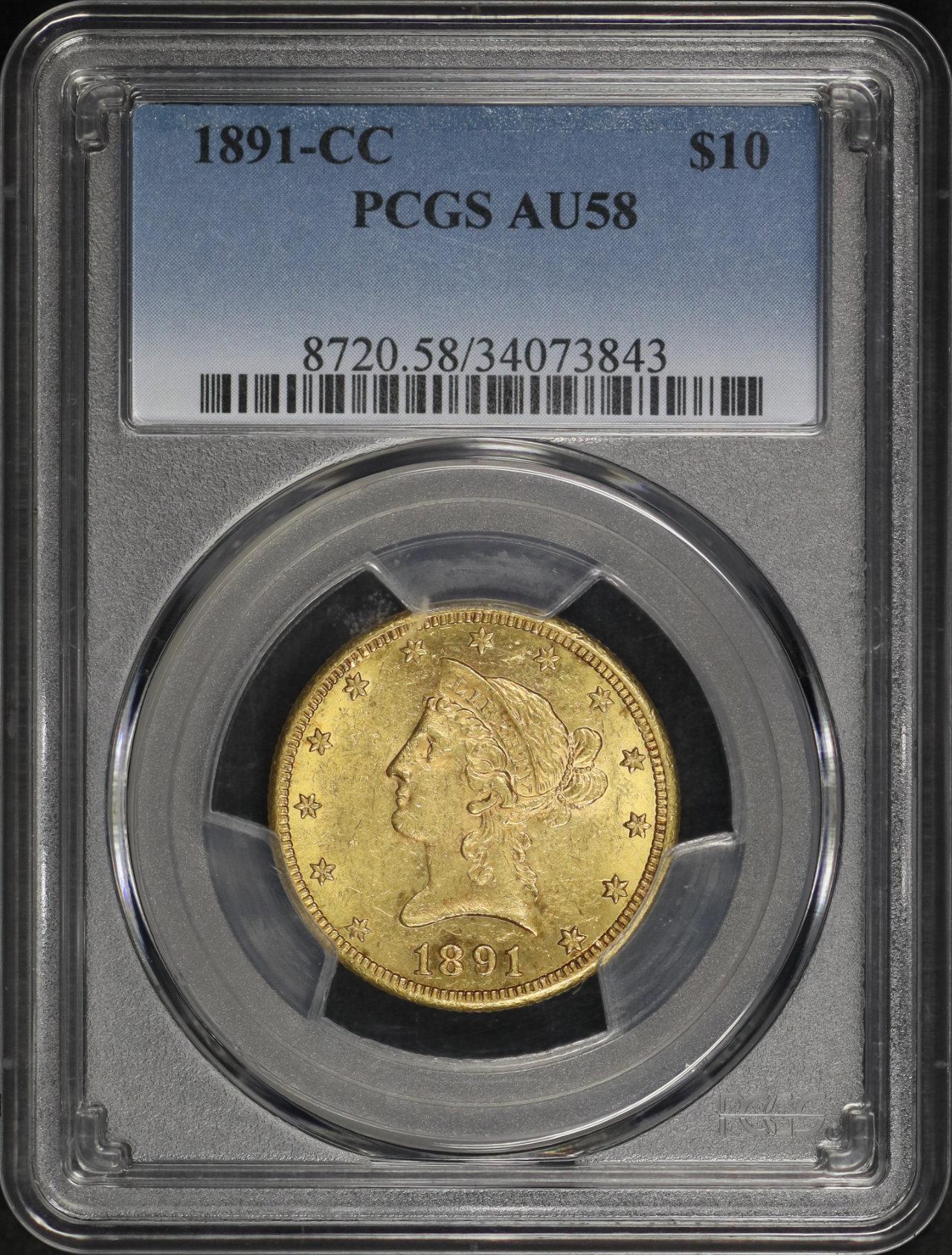 1891-CC Liberty Head $10 PCGS AU-58 designed by Christian Gobrecht.