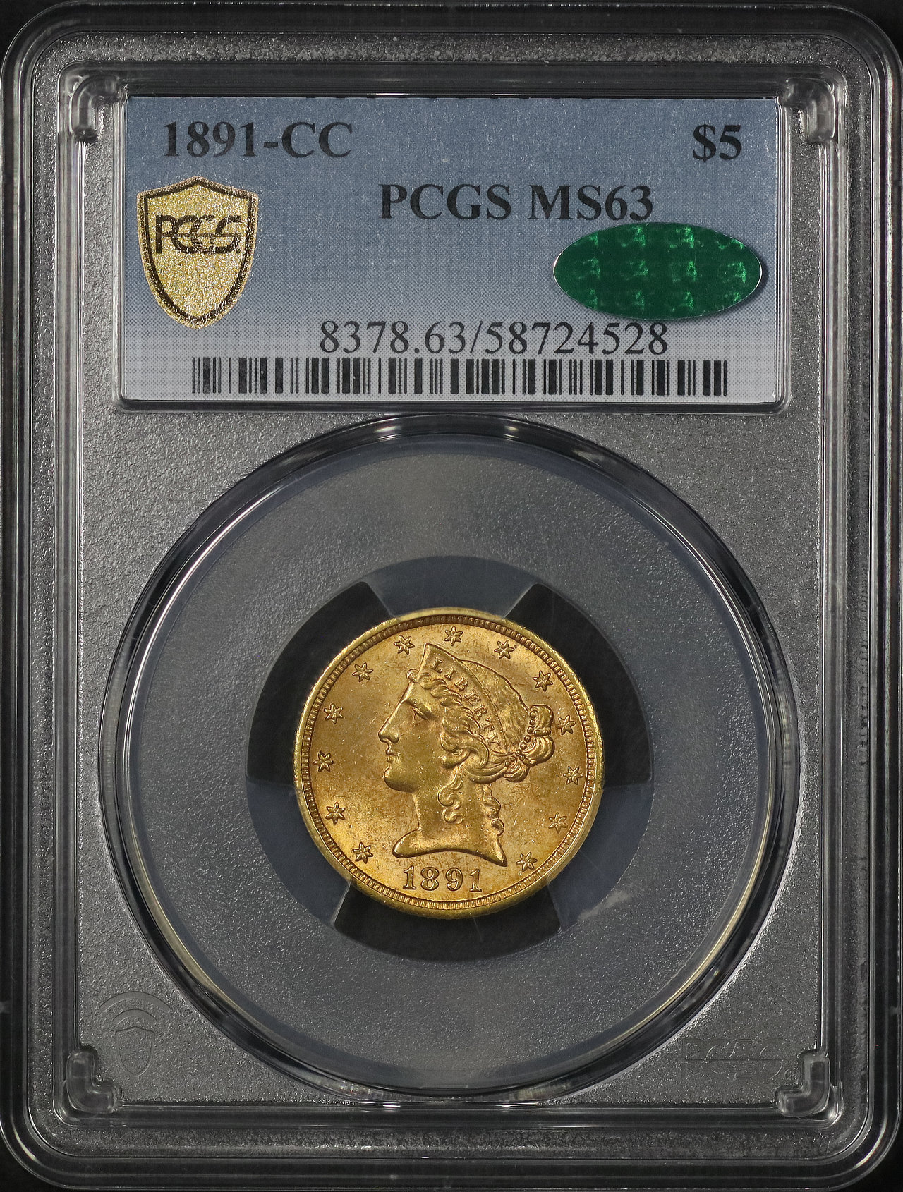 1891-CC Liberty Head $5 PCGS MS-63 CAC designed by Christian Gobrecht.