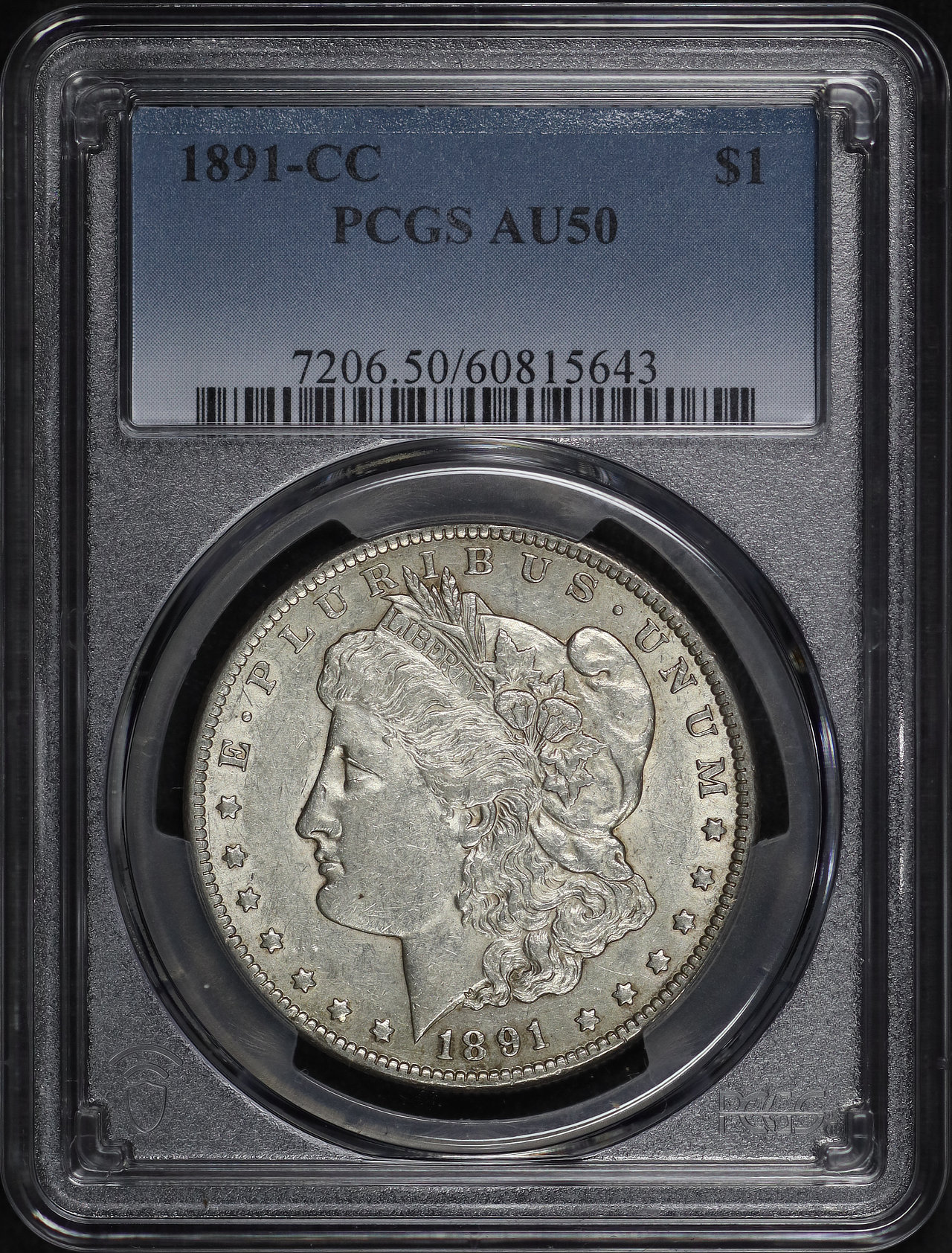1891-CC Morgan Dollar PCGS AU-50 designed by George T. Morgan.