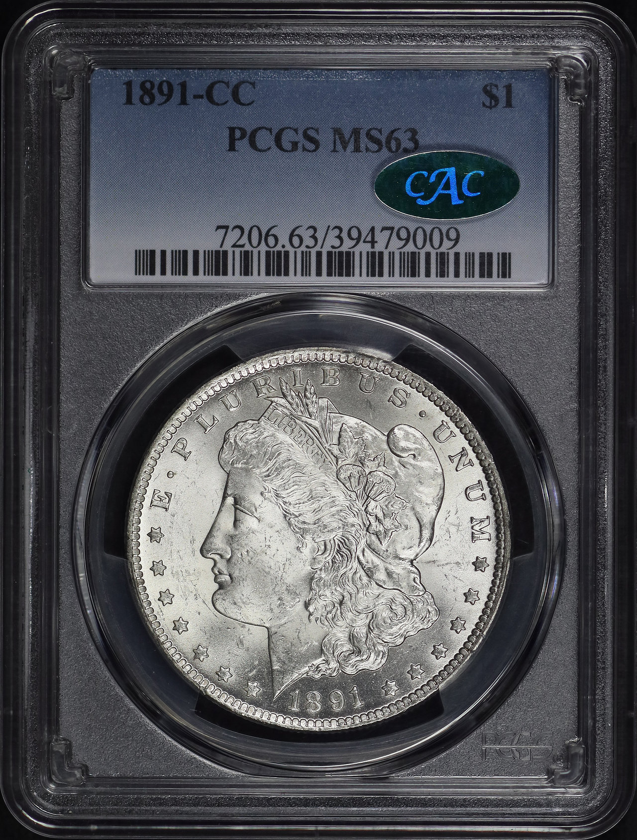 1891-CC Morgan Dollar PCGS MS-63 CAC designed by George T. Morgan.
