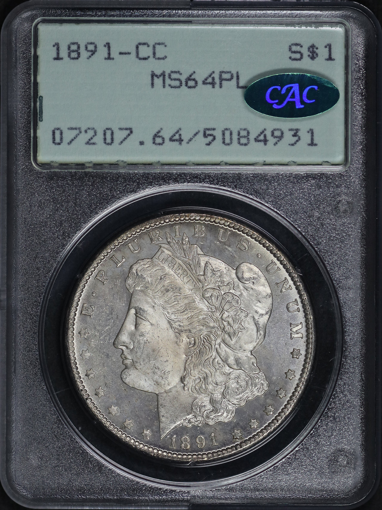 1891-CC Morgan Dollar PCGS MS-64 PL CAC Old Green Rattler Holder designed by George T. Morgan.