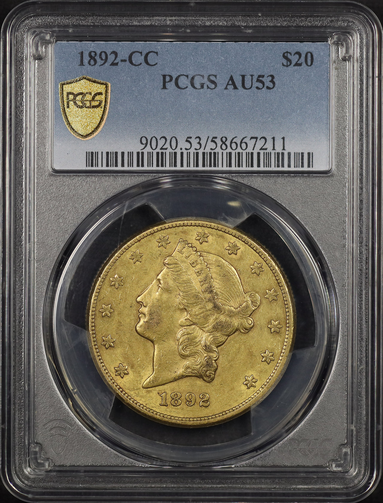 1892-CC Liberty Head $20 Type 3 PCGS AU-53 designed by James Barton Longacre.