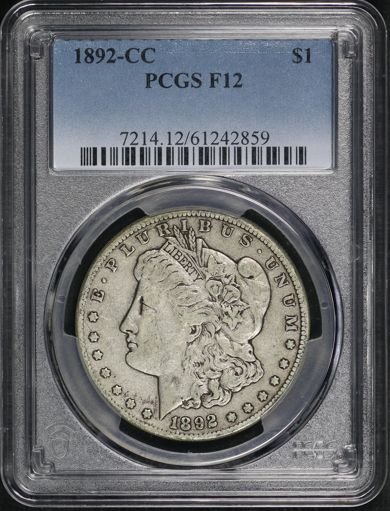 1892-CC Morgan Dollar PCGS F-12 designed by George T. Morgan.