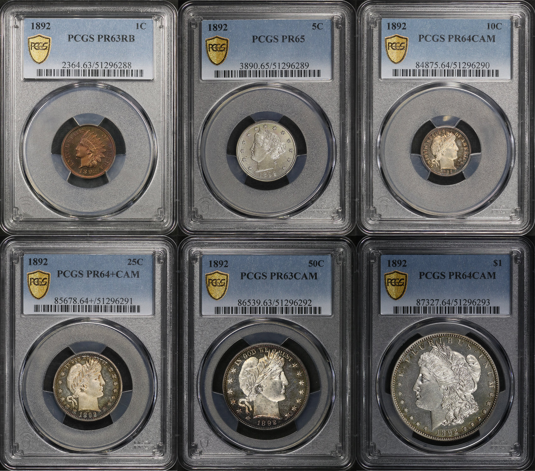1892 Proof 1C, 5C, 10C, 25C, 50C, & $1 PCGS PR-63 Thur PR-65 6 Coin Set.