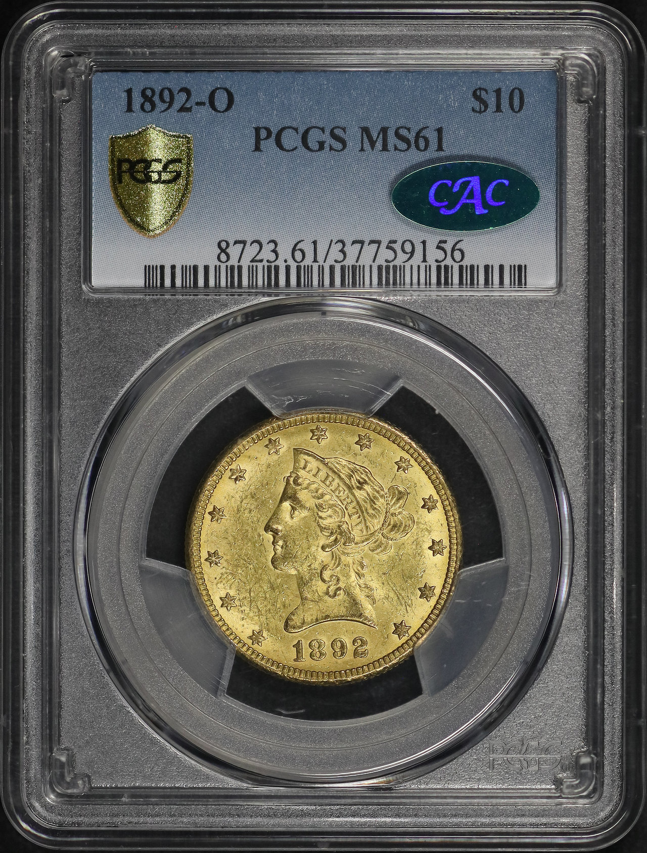 1892-O Liberty Head $10 PCGS MS-61 CAC designed by Christian Gobrecht.
