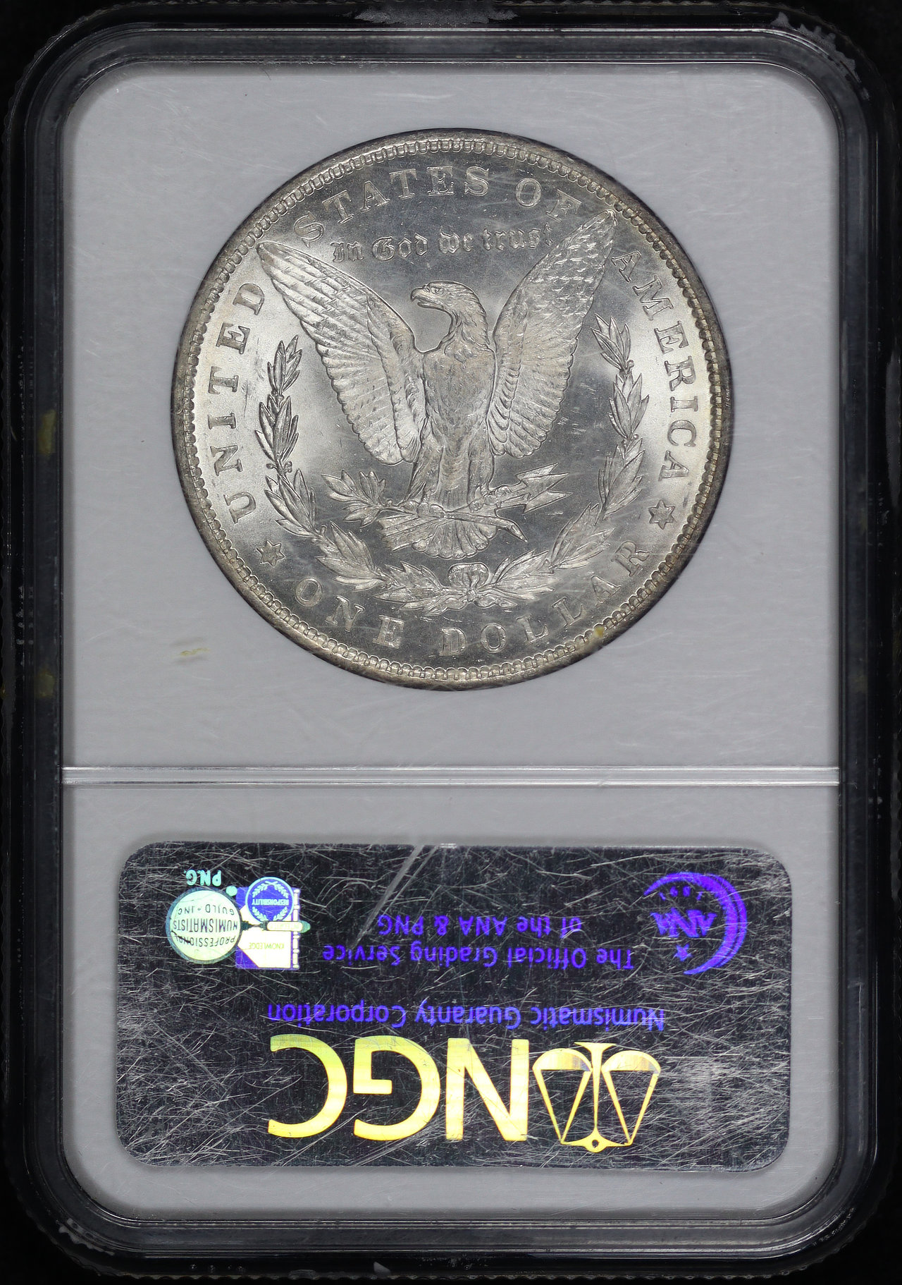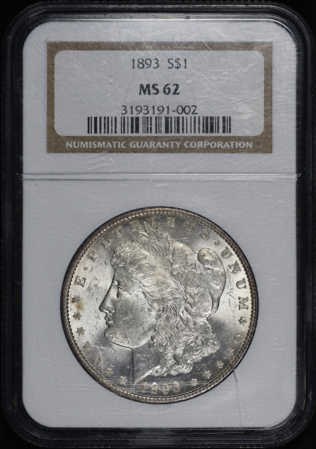 1893 Morgan Dollar NGC MS-62. There are scuffs and scratches on both sides of the NGC holder.