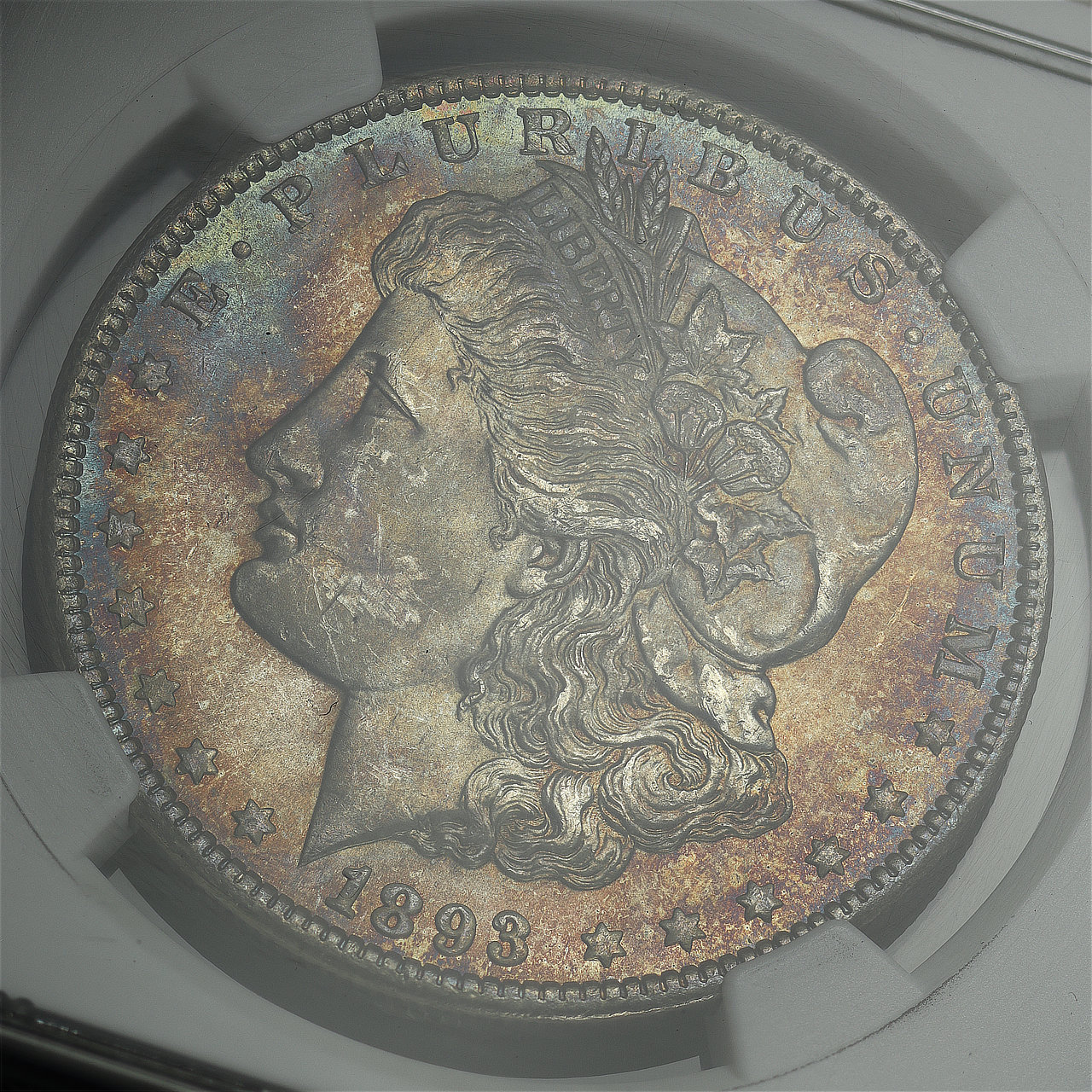 1893 Morgan Dollar NGC MS-64+. Both sides display remarkable, smoky sunset hue toning, with a vibrant streak of blue along the top rim of the obverse!