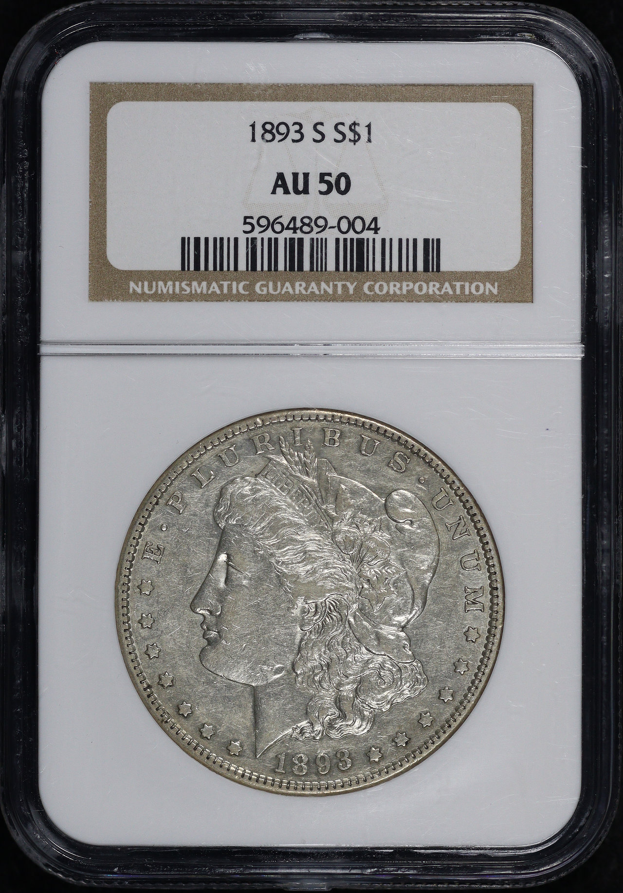 1893-S Morgan Dollar NGC AU-50. There are minor scuffs and scratches on the NGC holder.