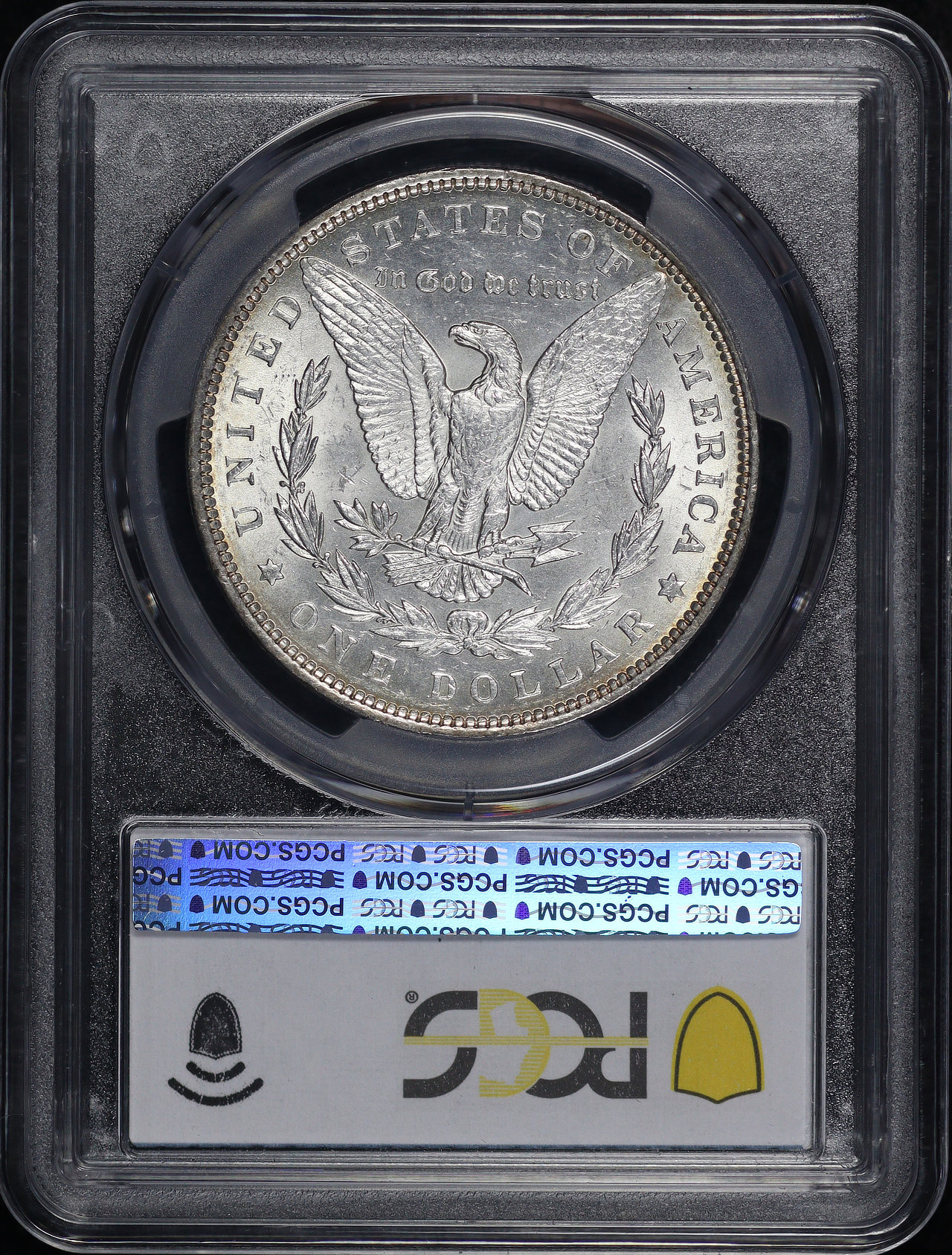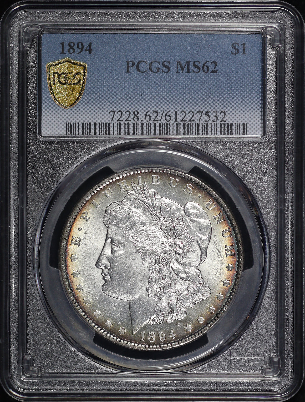 1894 Morgan Dollar PCGS MS-62 designed by George T. Morgan. There is nice, dark blue and crimson hue toning along the rim of the obverse.