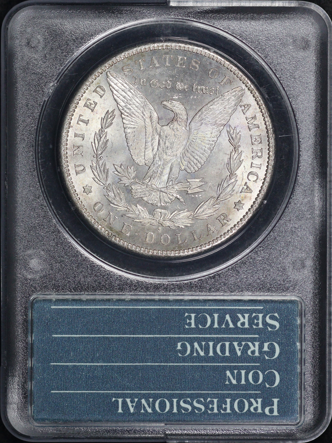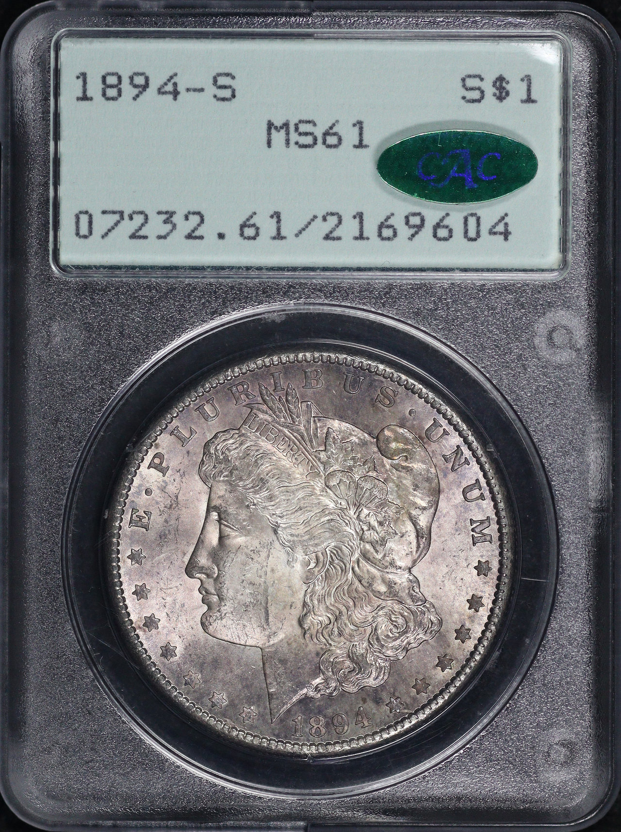 1894-S Morgan Dollar PCGS MS-61 CAC Old Green Rattler Holder designed by George T. Morgan. There is nice, faint violet hue toning on the obverse!