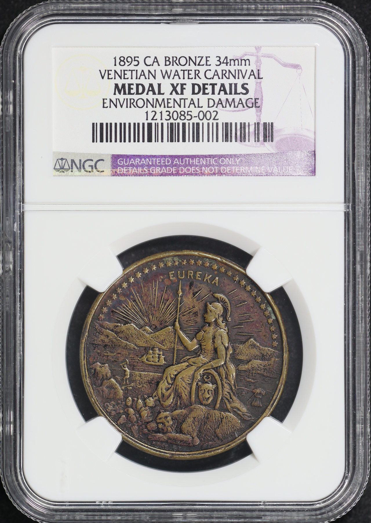 1895 CA Venetian Water Carnival Bronze 34mm Medal NGC XF Details Environmental Damage. This coin has the given grade as a result of environmental damage, showing spotty discoloration, pitting, and eroded detail.