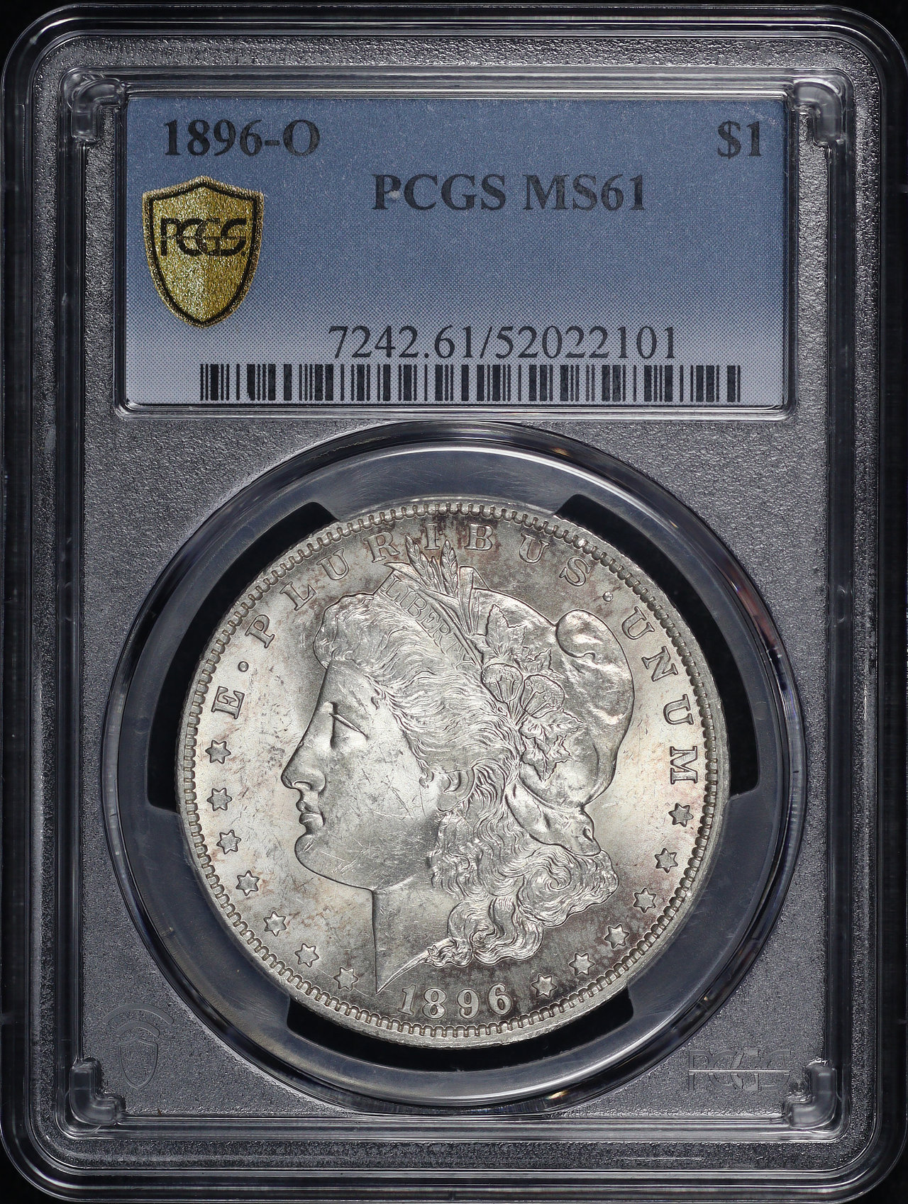 1896-O Morgan Dollar PCGS MS-61 designed by George T. Morgan. There is some spotty, dark crimson hue toning on the obverse.