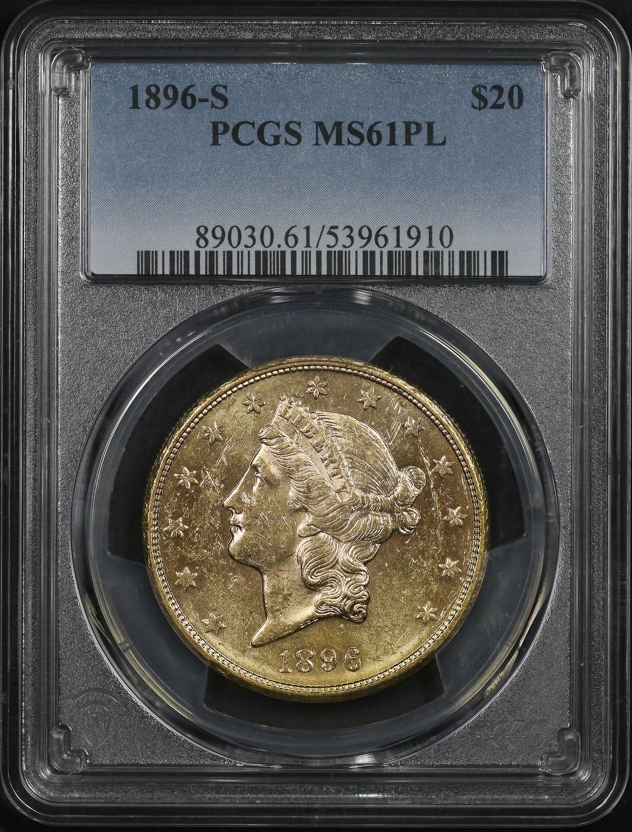 1896-S Liberty Head $20 Type 3 PCGS MS-61 PL designed by James Barton Longacre.