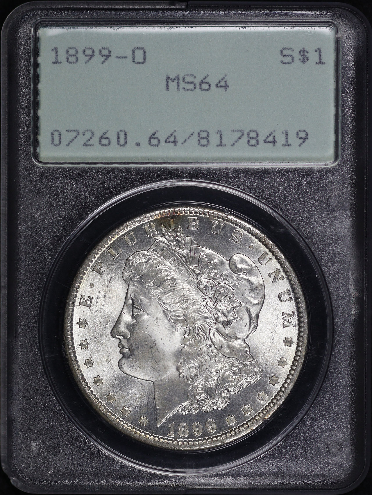 1899-O Morgan Dollar PCGS MS-64 Old Green Rattler Holder designed by George T. Morgan.