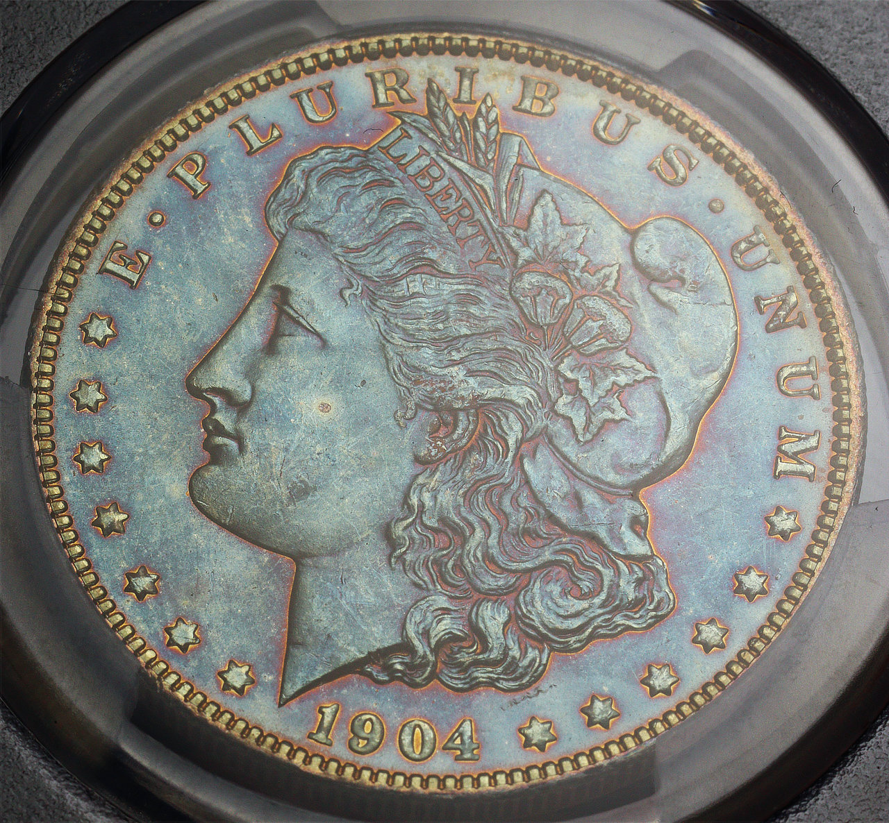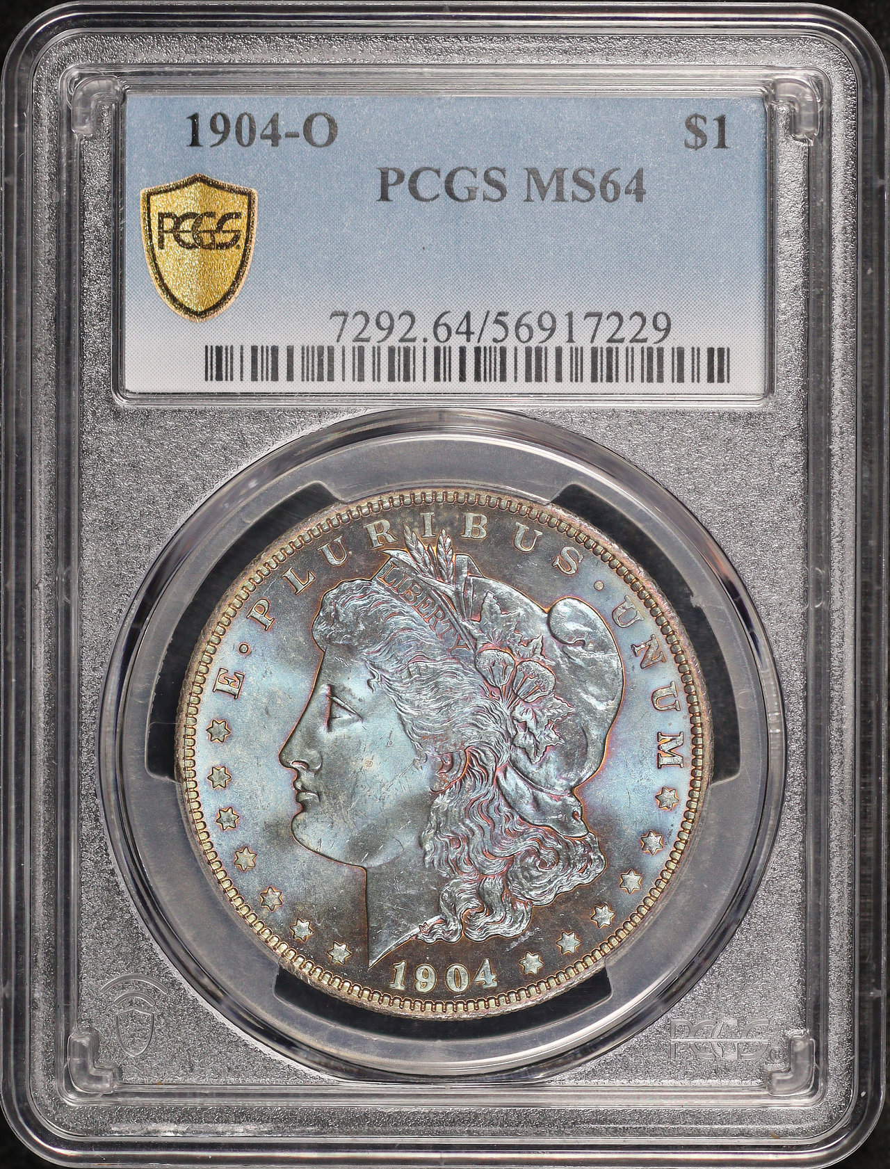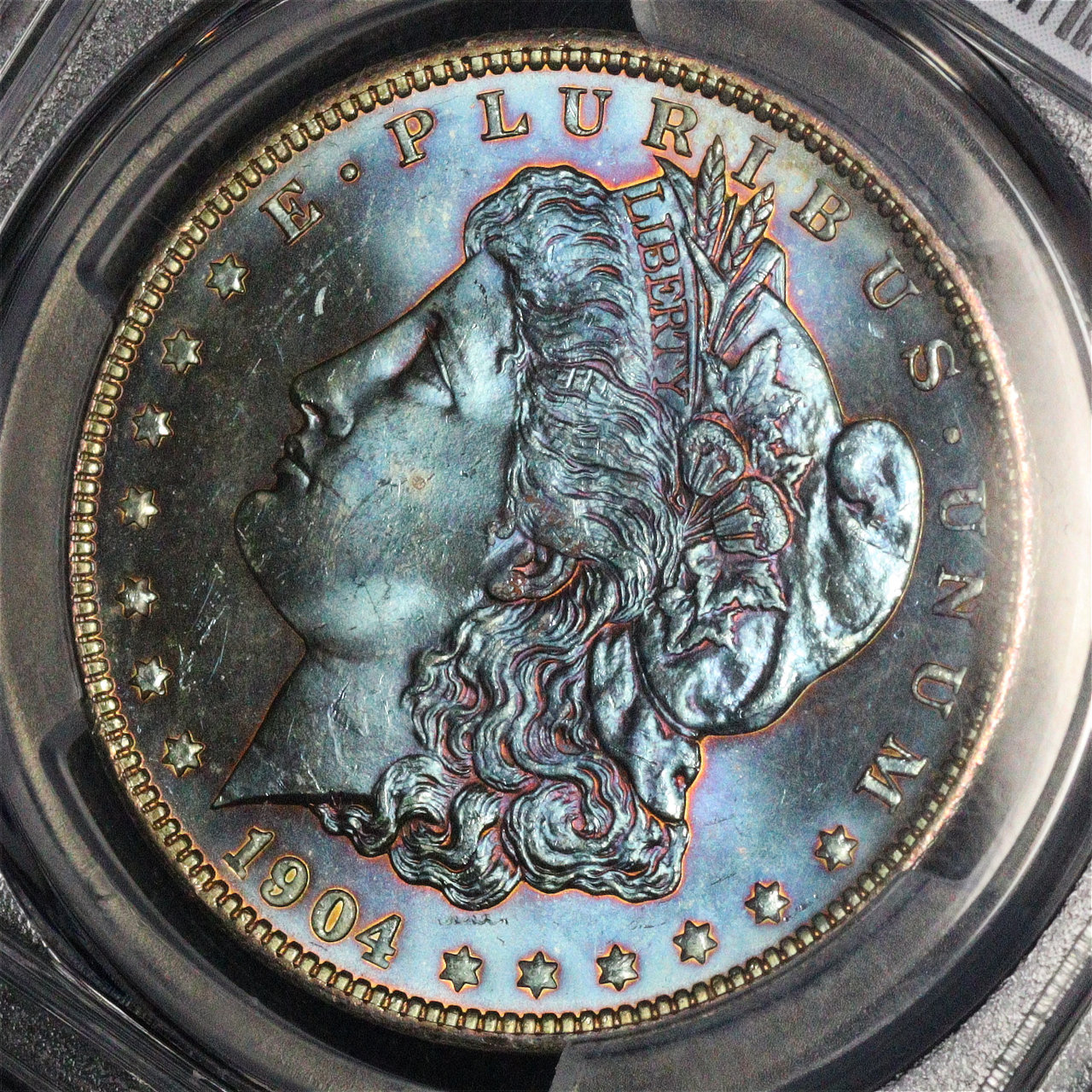 1904-O Morgan Dollar PCGS MS-64 Near-Monochromatic Blueberry Obverse Toning