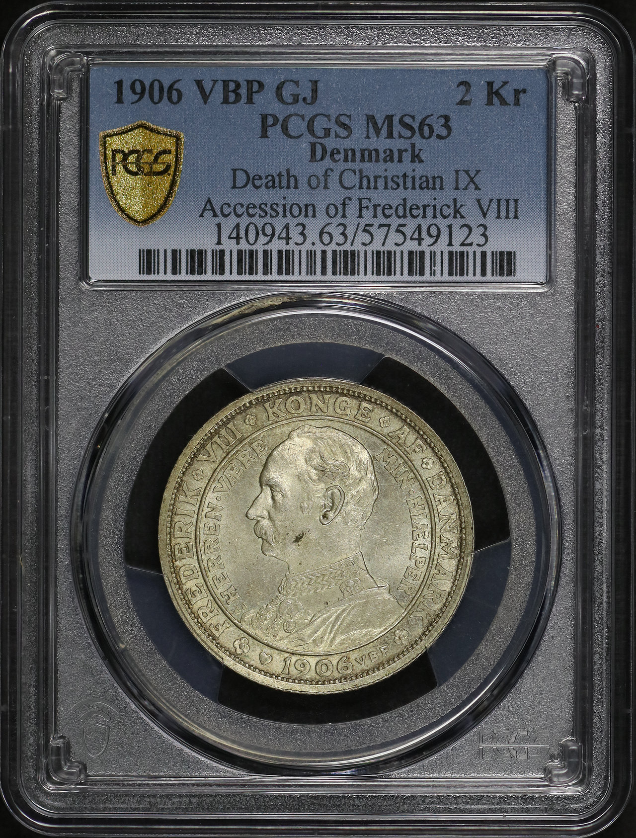 1906 VBP GJ Denmark Death of Christian IX-Accession of Frederick VIII 2Kr PCGS MS-63