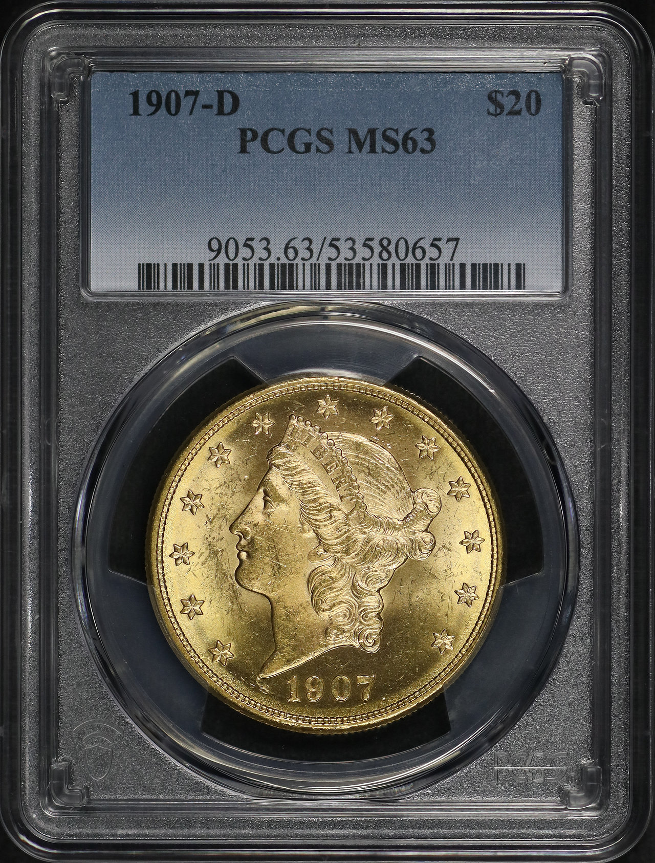 1907-D Liberty Head $20 Type 3 PCGS MS-63 designed by James Barton Longacre.