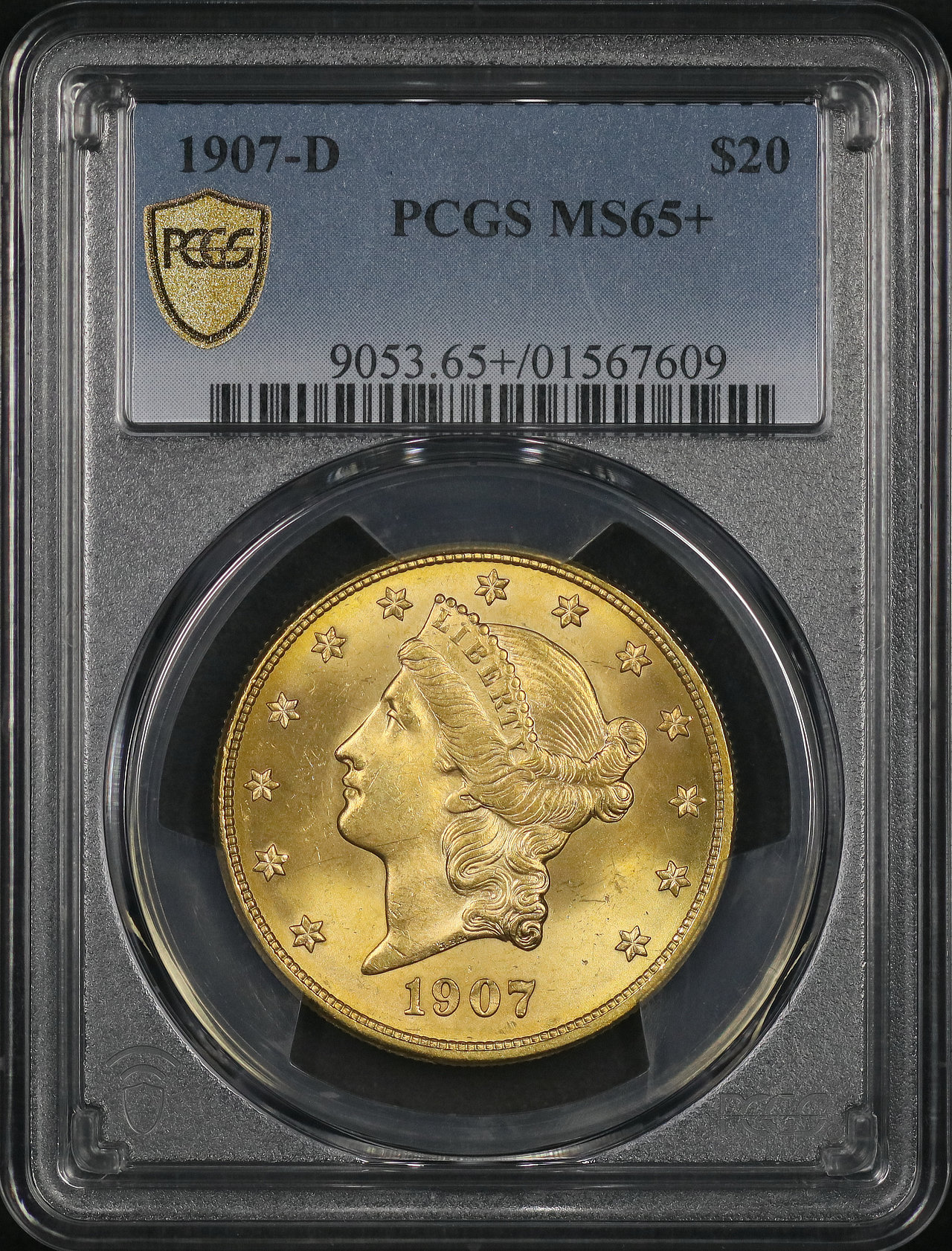 1907-D Liberty Head $20 Type 3 PCGS MS-65+ designed by James Barton Longacre.