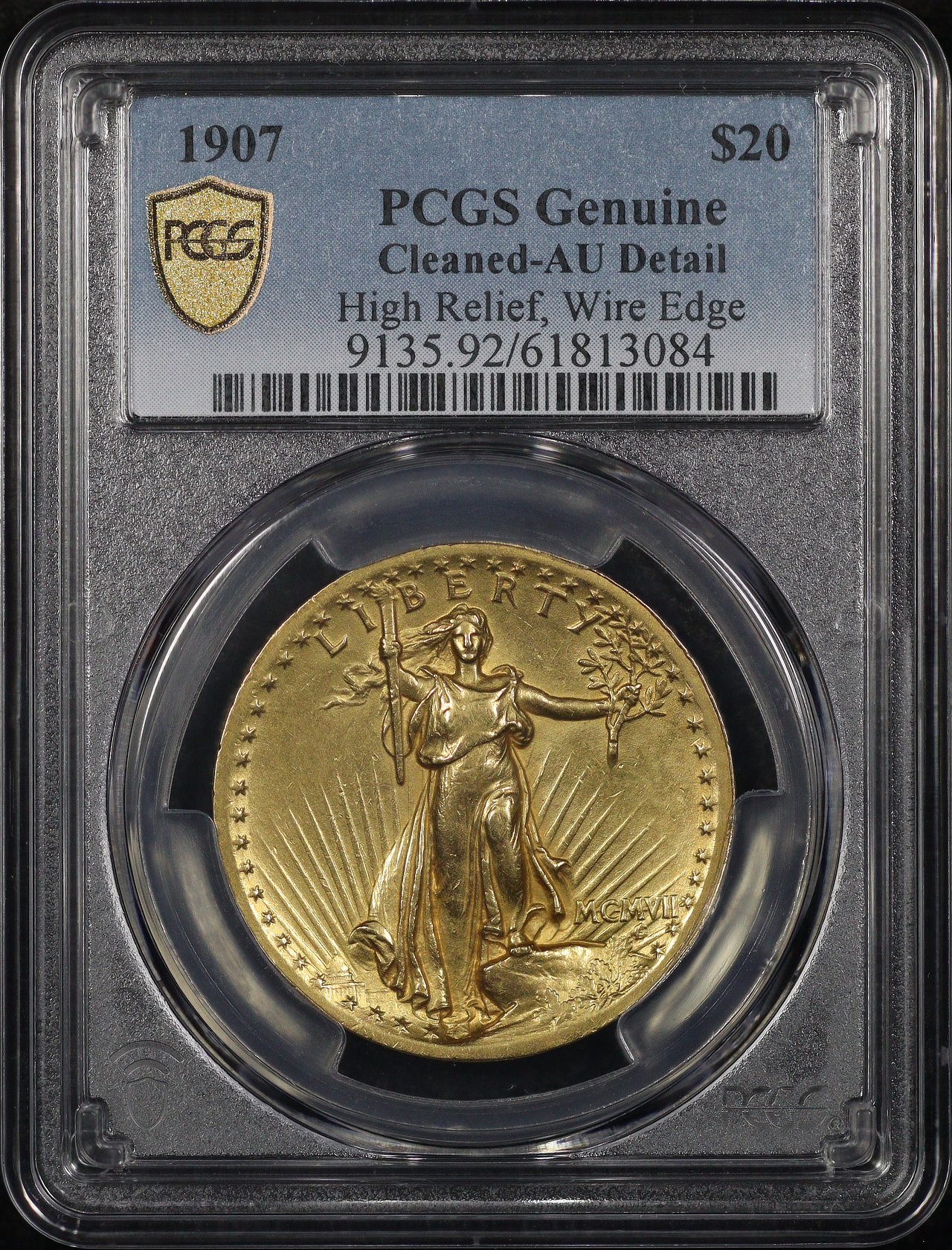 1907 St. Gaudens $20 High Relief, Wire Edge PCGS AU Details Cleaned designed by Augustus Saint Gaudens. This coin has the given grade as a result of it having been improperly cleaned, showing faint hairlines and glossy surfaces.