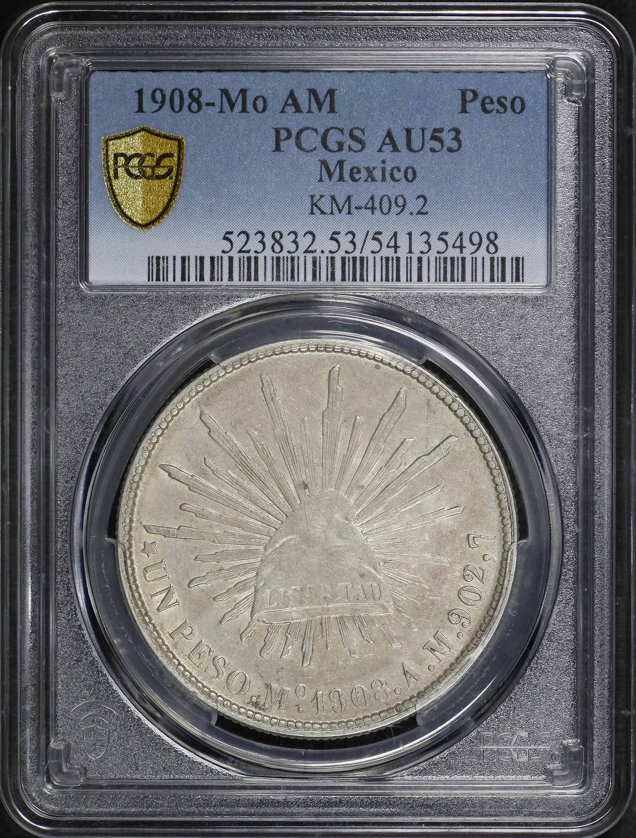 1908-Mo AM Mexico KM-409.2 Peso PCGS AU-53.